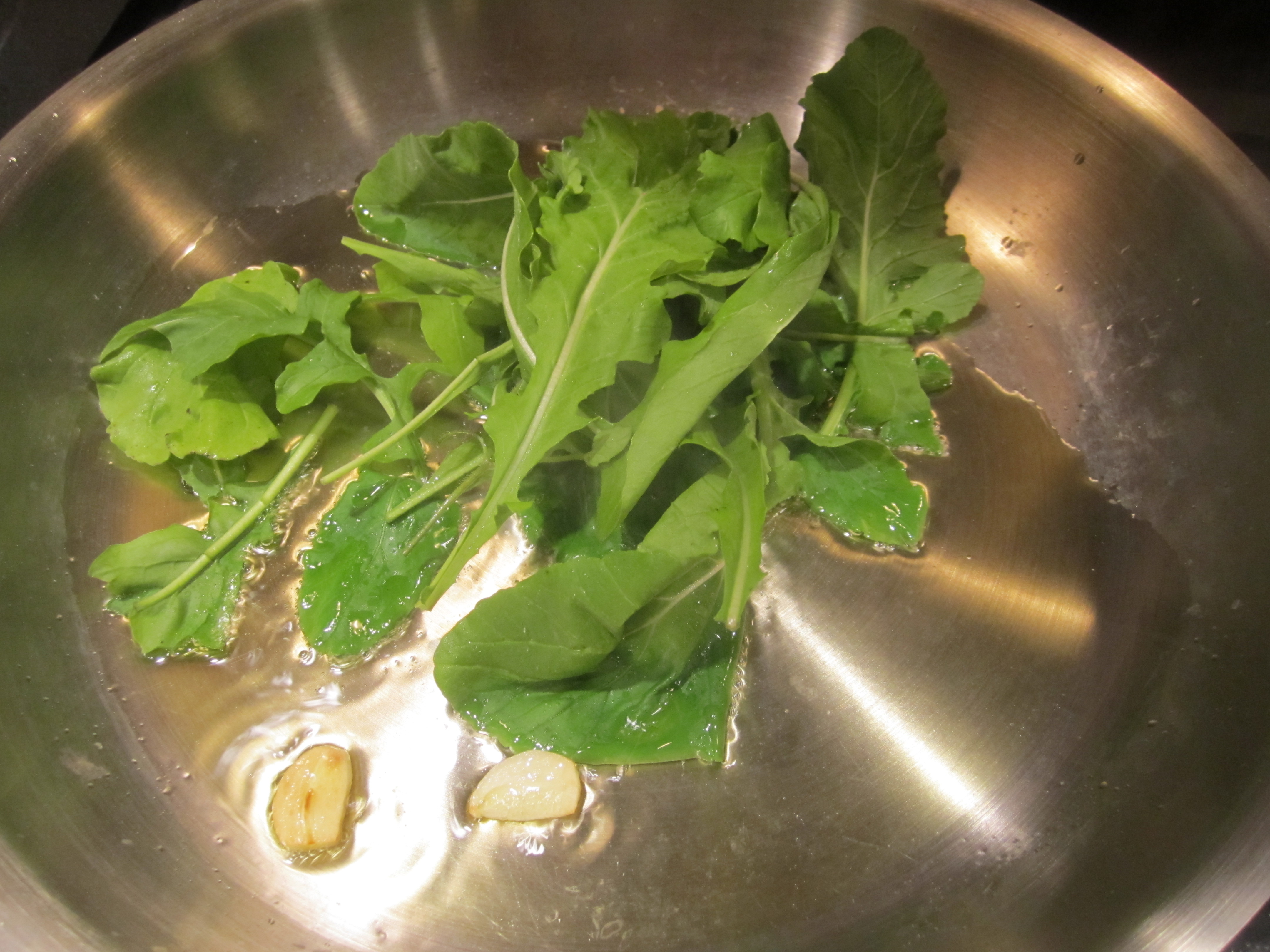 Place garlic cloves face down in skillet with oil. Heat until garlic begins to turn golden. Add arugula leaves and toss in hot oil. Set aside until pasta is cooked.