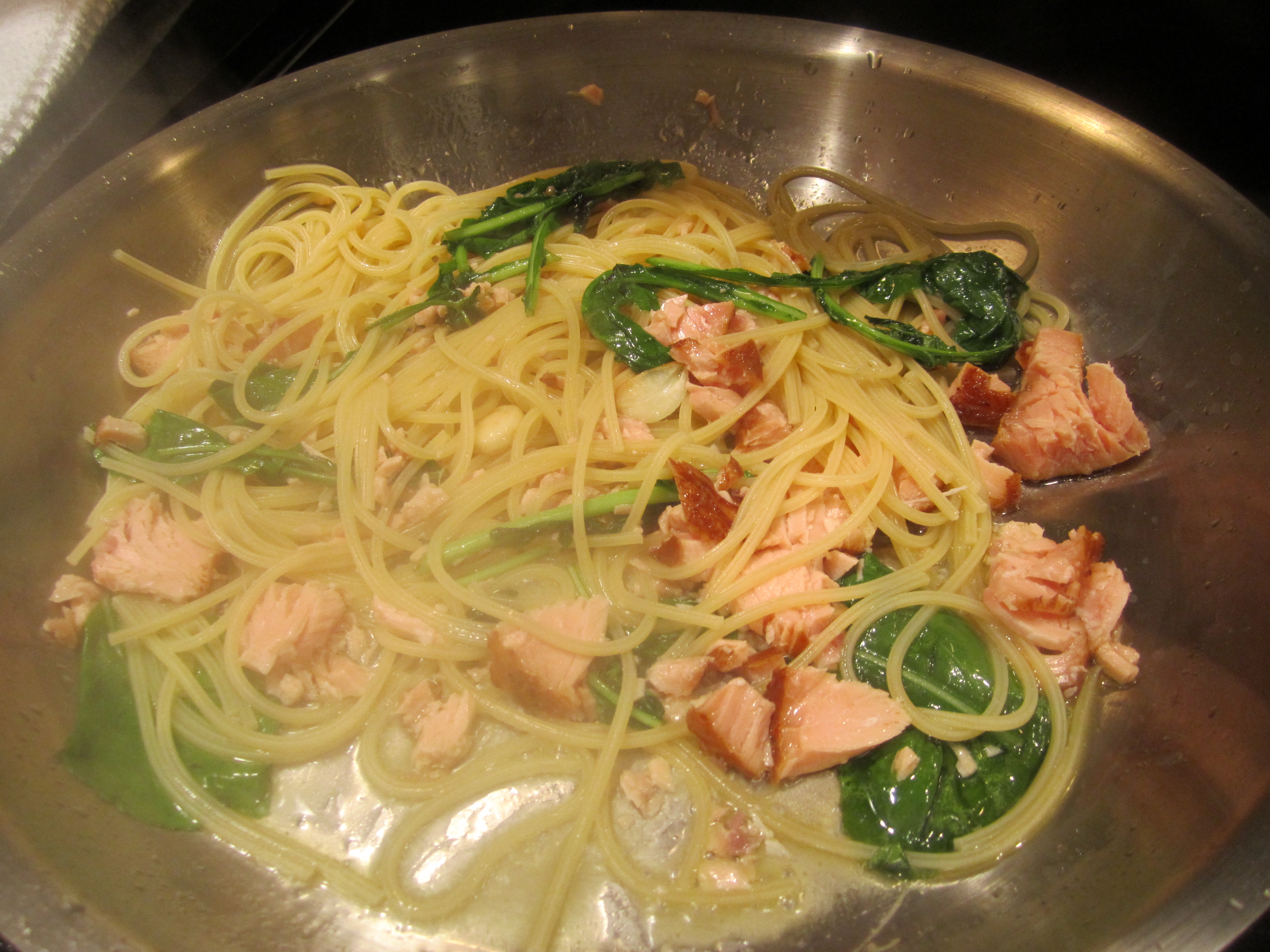 Add cooked pasta, smoked salmon, and a quarter-cup of pasta cooking liquid. Toss over low heat for a minute or so.