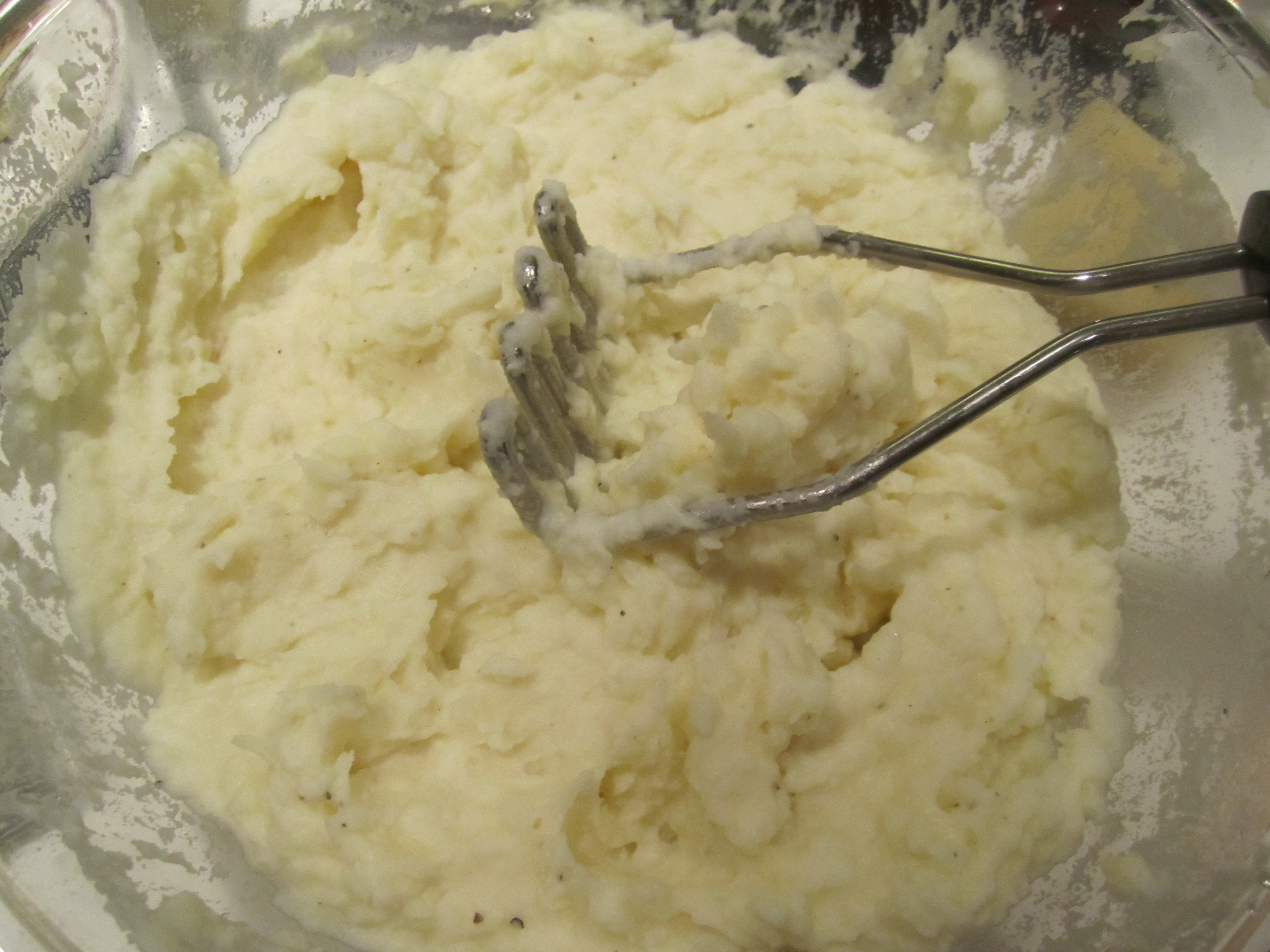 I began by making mashed potatoes. I used Idaho potatoes, since I couldn’t find my preferred yukon golds here. I peeled and diced them, placed them in salted, boiling water and simmered them until soft (about 20 minutes). I mashed them with an old-fashioned masher, while adding in butter, grated cheese (manchego) and half-and-half. Although you want these to be fairly stiff, add back some of the salty potato cooking liquid to get them to a creamy consistency. These may be made an hour or so ahead.