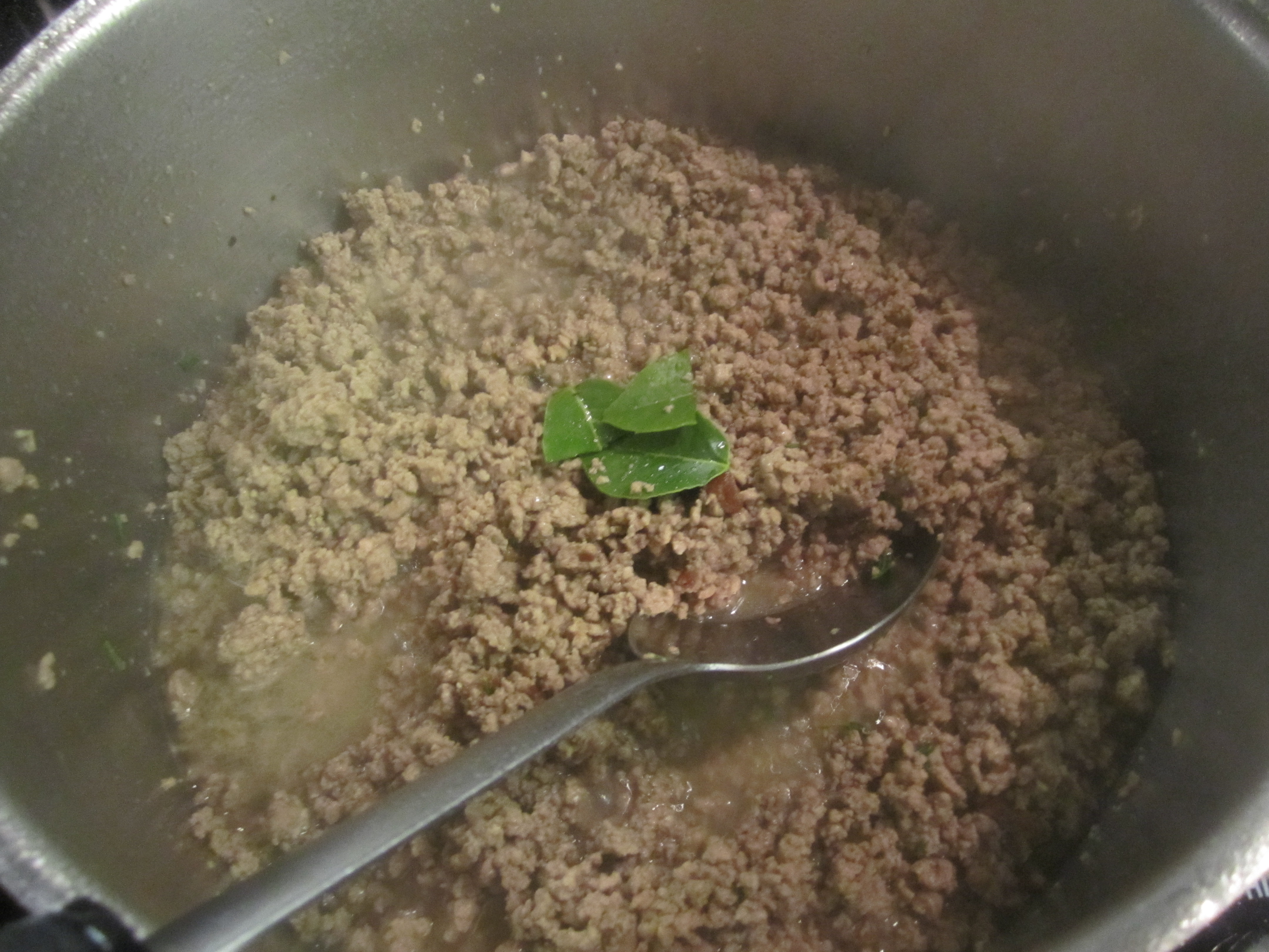 Heat half the oil in a dutch oven and add the lamb and 2 bay leaves. Saute until lamb loses its red color but not so long as to brown the meat.