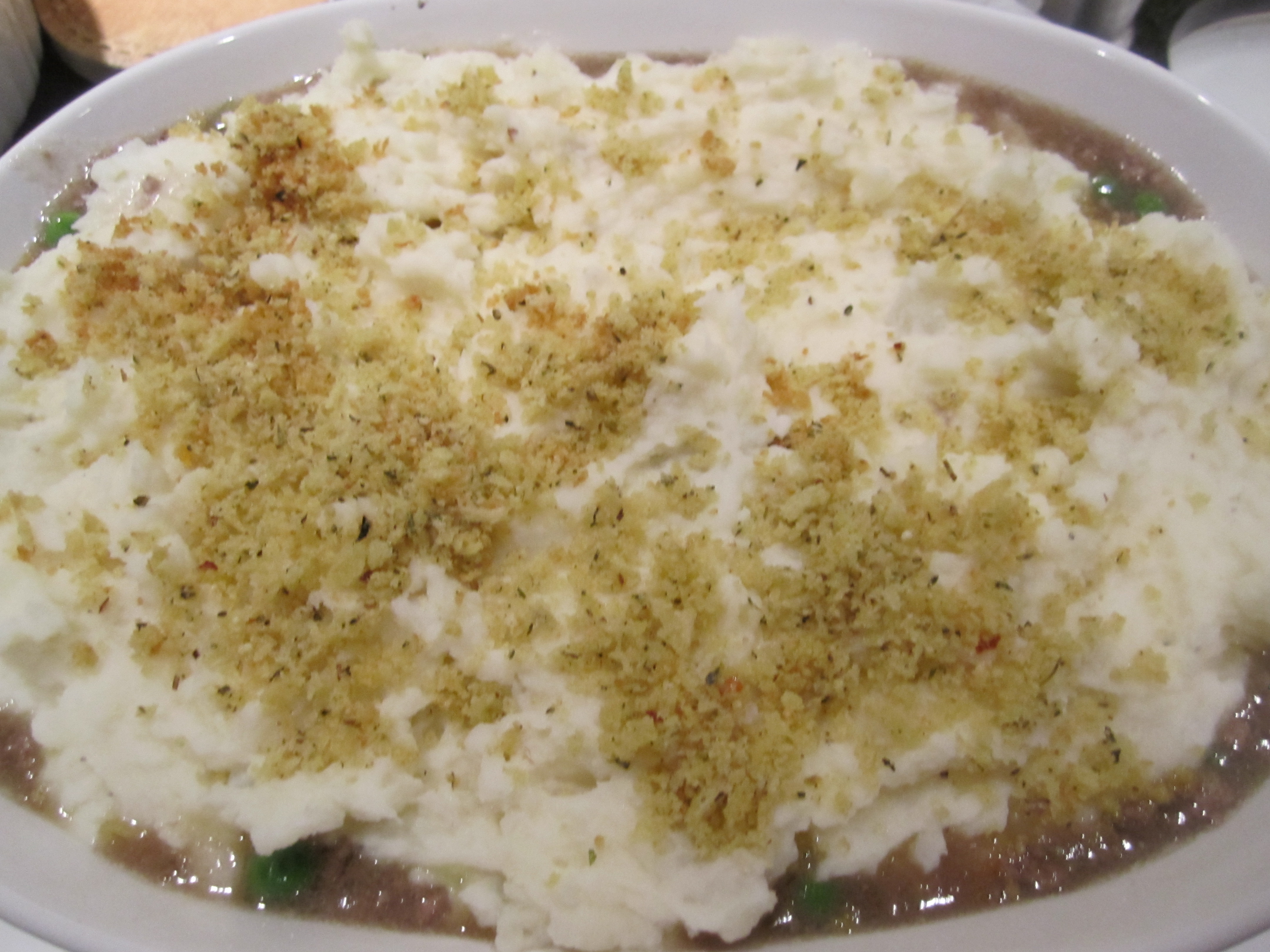 For final assembly, spread a layer of the mashed potatoes over the meat, then top with toasted crumbs.