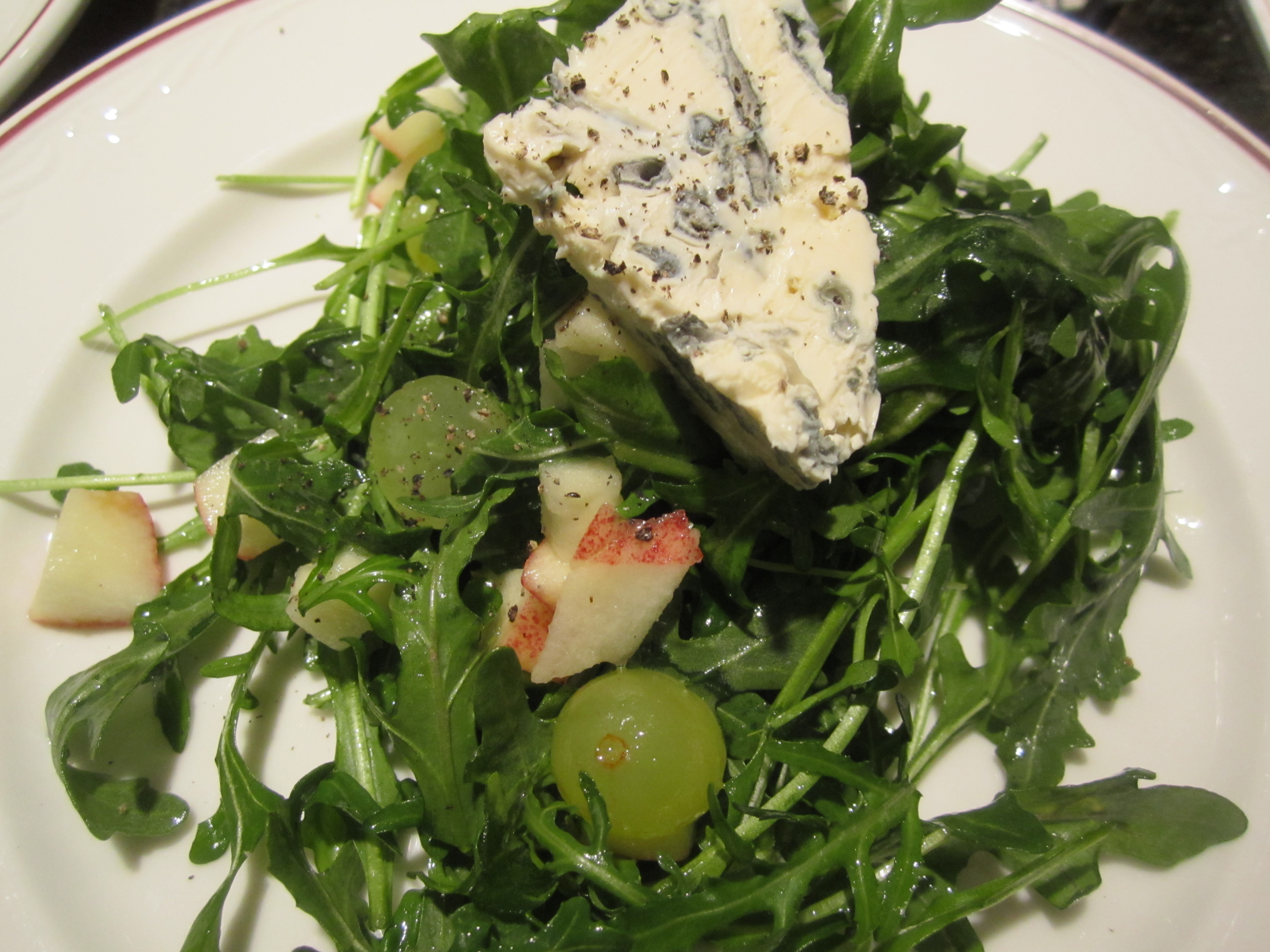 For a first course, we began with a salad of baby arugula, diced apples and grapes (all easy to find in the winter), topped with stilton cheese, dressed with lemon juice, agave and olive oil.