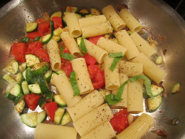 Add pasta to skillet with vegetables, along with a half-cup of pasta cooking liquid. Saute for about a minute.