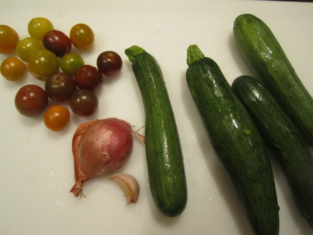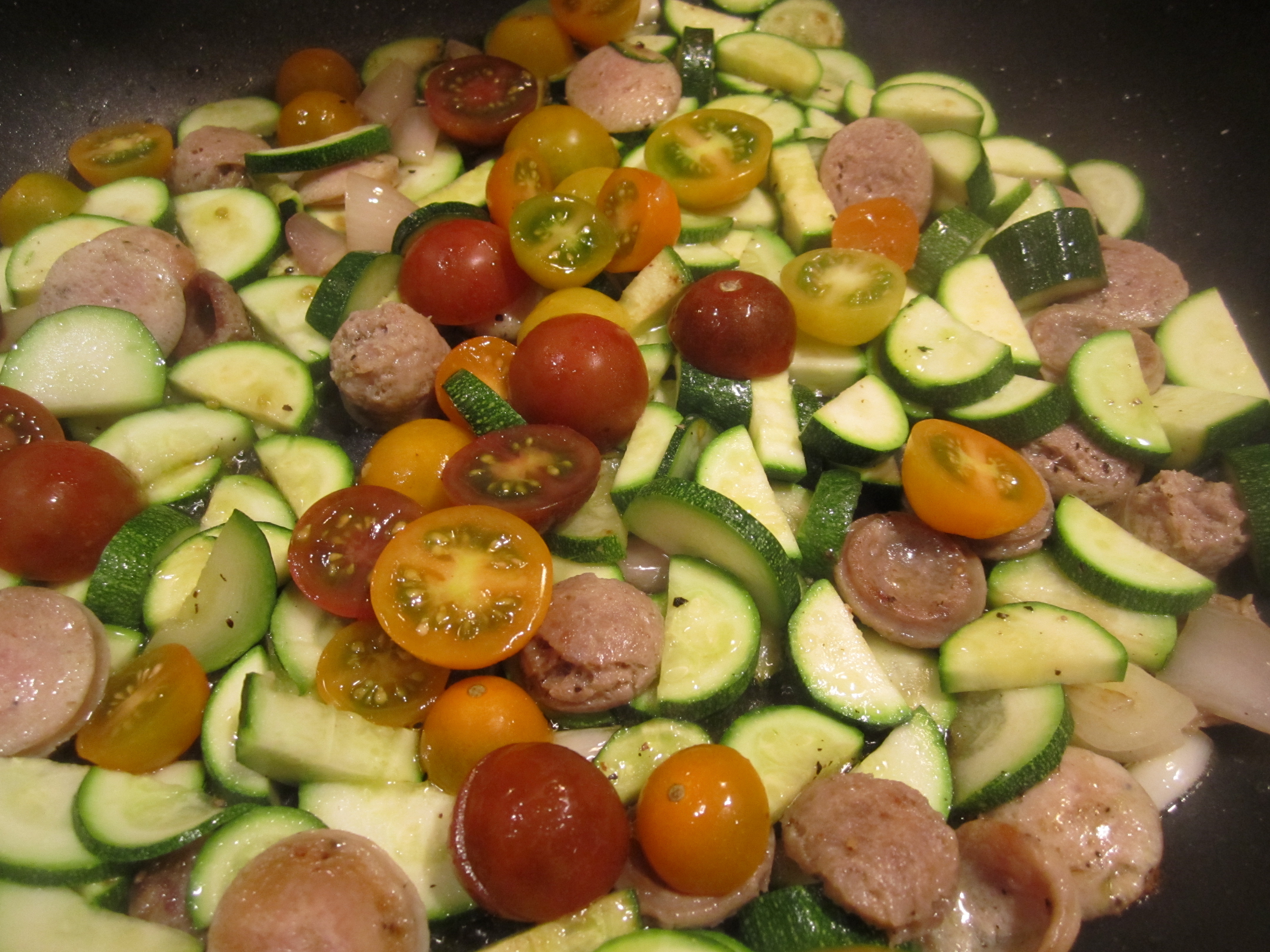 The second dish made use of some leftover cooked sausage I had in the freezer–zucchini with sausage and cherry tomatoes–hearty but summery.