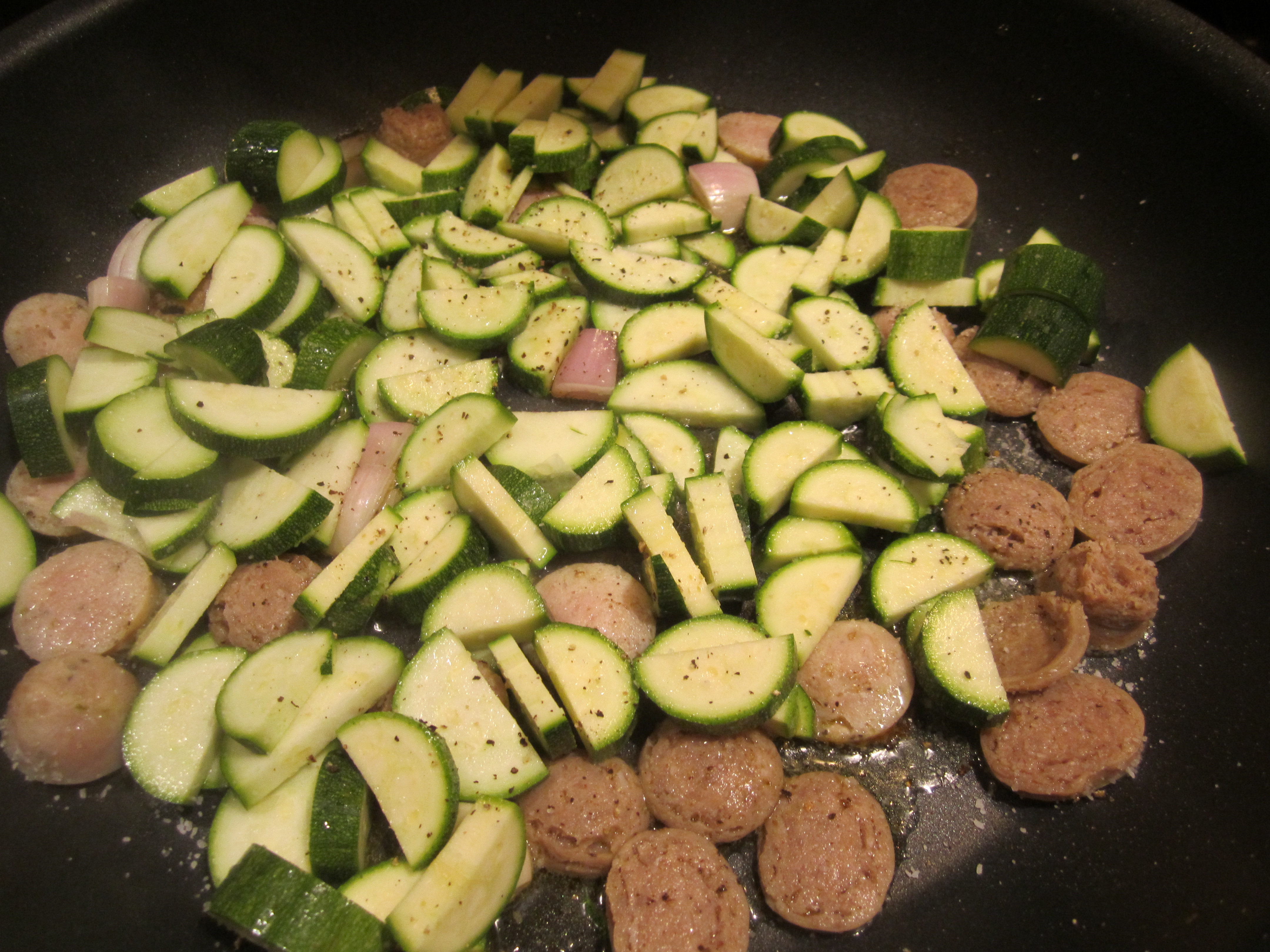 While pasta is cooking, in a broad skillet, place sausage, shallots and garlic. Saute on medium heat for about 3 minutes, then add zucchini and continue sauteing on high heat for about 5 minutes.