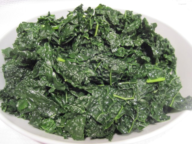 Bring a large pot of salted water to the boil. Strip leaves from stems of tuscan kale. Slice leaves crosswise into 1″ ribbons. Boil for about 5 minutes, then drain and set aside.