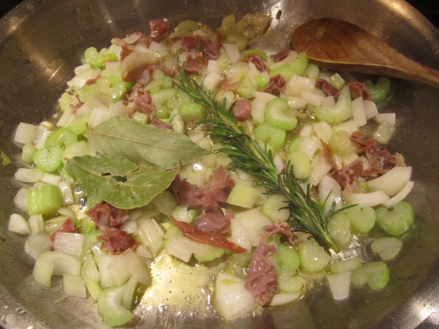 In a large skillet or dutch oven, place prosciutto, onion, celery, garlic, bay leaves and rosemary in olive oil. Turn heat to medium and saute for about 10 minutes, or until softened and aromatic.