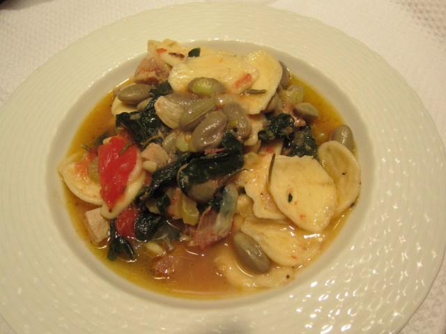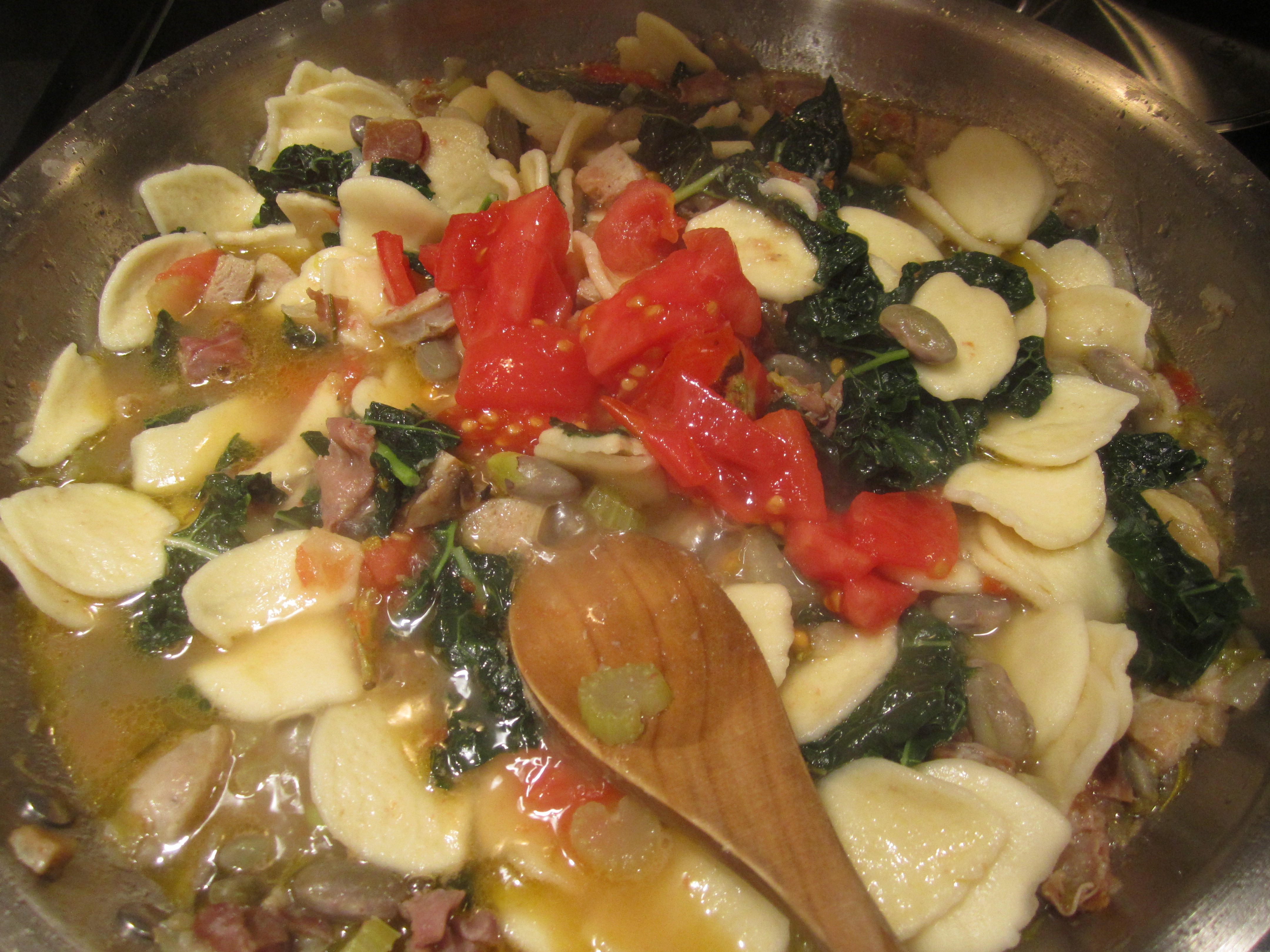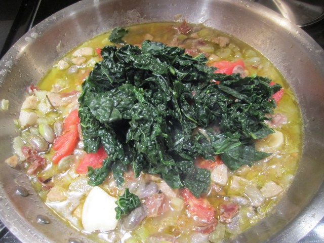 Today’s preparation begins with a saute of prosciutto and aromatics, then the beans are added, along with some broth, and all is simmered for about 45 minutes. Tuscan kale is blanched separately, tomatoes are peeled and diced and both are added towards the end. Pasta is cooked separately and added at the end. A drizzle of olive oil and a sprinkle of pecorino make the dish irresistable (especially with a piece of bread).
