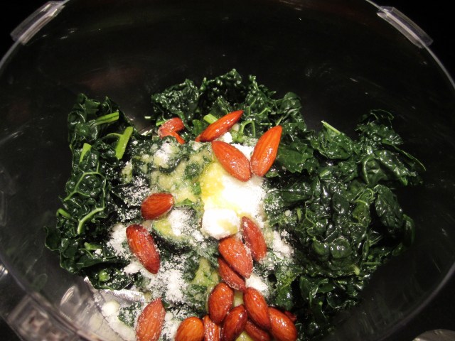 Because the cooked kale is much milder than raw basil, I like to use stronger ingredients to accompany it. I use smoked almonds instead of pine nuts (although roasted salted almonds are fine as well) and grated pecorino only (no parmigiano necessary to temper the strength and saltiness of the pecorino). I add black pepper to this pesto, whereas I do not add it to basil pesto.
