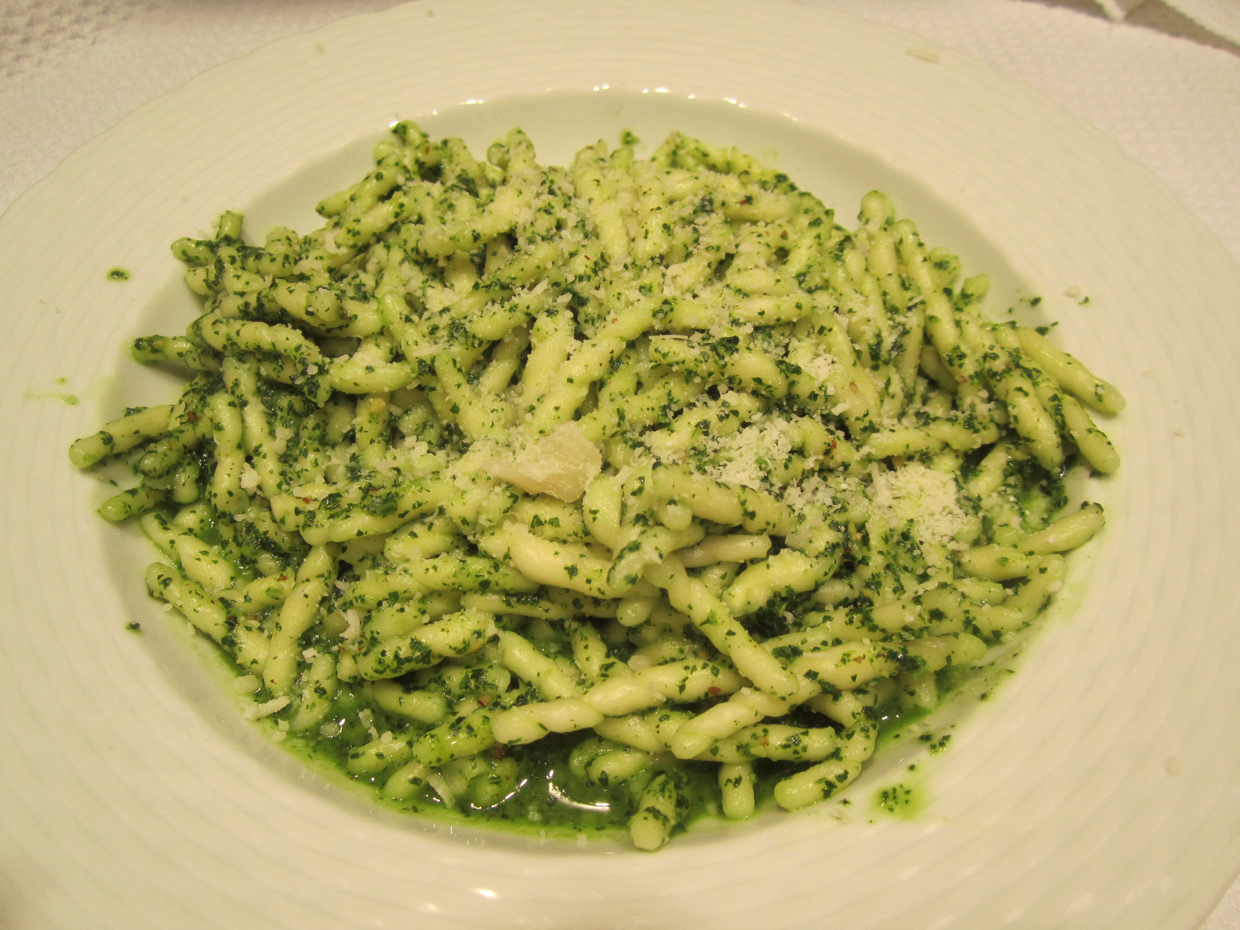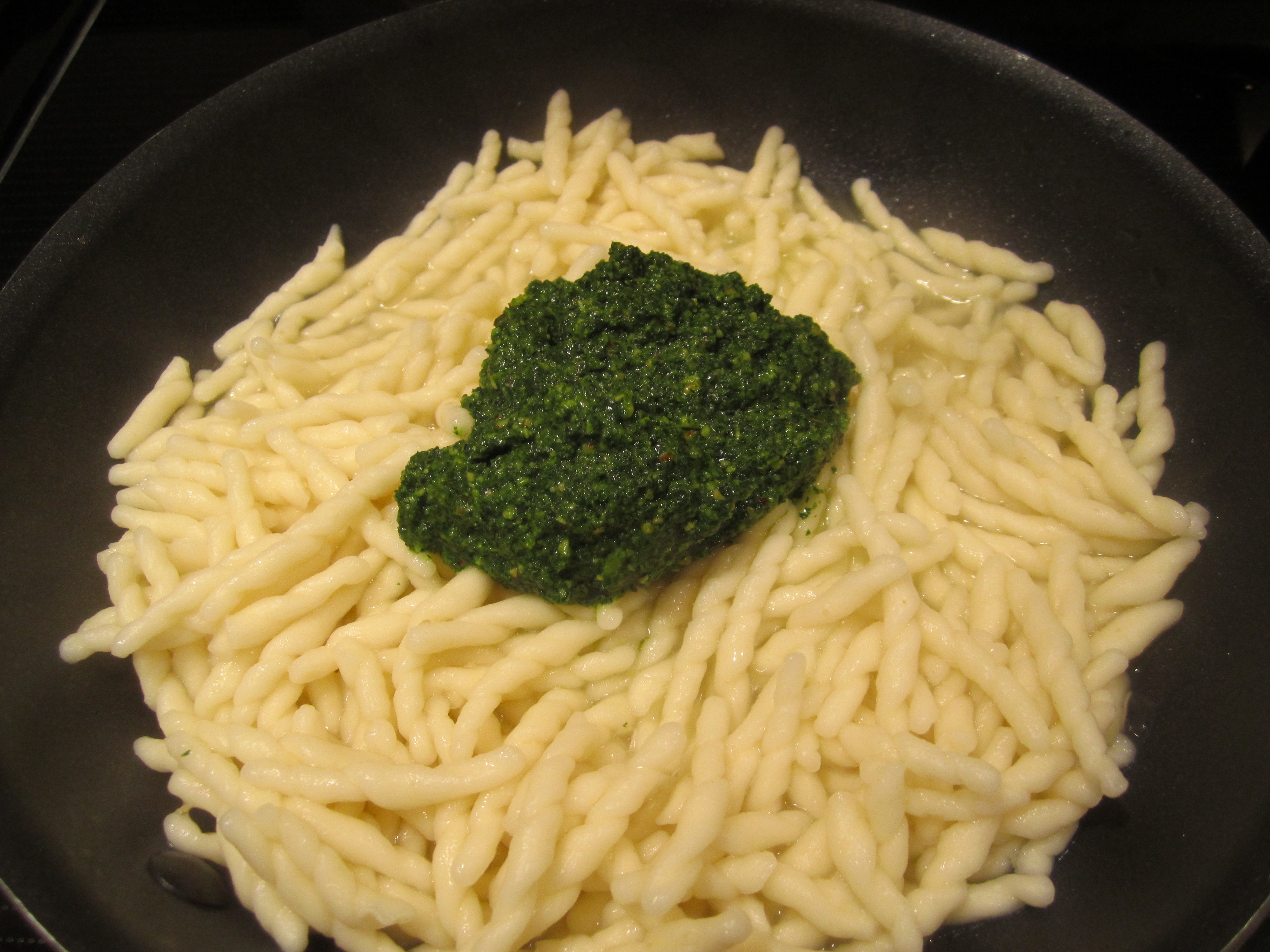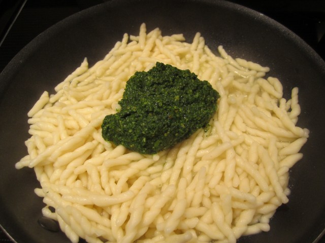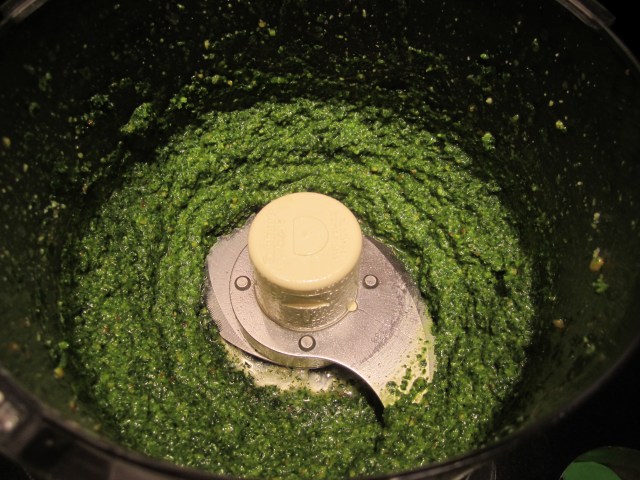 This pesto offers a couple of advantages over traditional basil pesto. For one, it can be heated in a saucepan prior to serving. Because of its sturdiness and the fact that it’s been blanched, it won’t blacken the way raw basil leaves do when ground and exposed to the air. To me, these two factors make this pesto an ideal dish to serve to guests (no racing to dress the pasta and get it on the table before it turns luke-warm and the pesto turns brown).