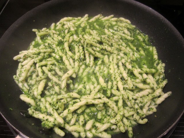 After the pasta is cooked, I transfer it to a skillet with a touch of broth and stir in the pesto–copious amounts of it. I simmer for a minute on low heat to combine, then serve.