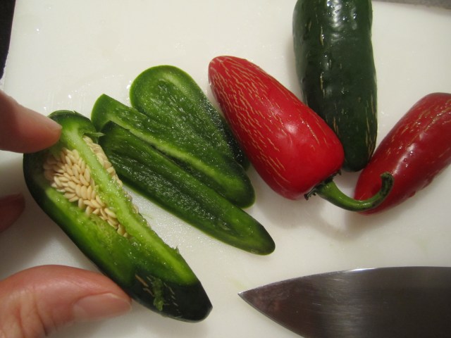 To make pesto, slice chili peppers into strips, discarding the seeds and slicing off any white ribs.