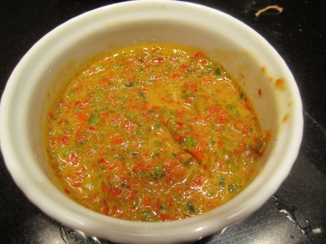 The heat of various “hot” peppers can vary widely. My vendor told me that the red peppers were significantly hotter than the green ones, but I tried a sliver of each one before determining in what ratio to combine them. It turned out that although the red ones were indeed stronger than the green ones, neither were too hot. Therefore, I used an equal amount of red and green to make the paste without the worry of scorching anyone’s palettes.
