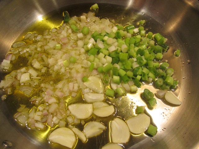 While pasta water is coming to a boil, in a skillet, saute shallots, garlic, scallions in olive oil on medium heat for 5 minutes.