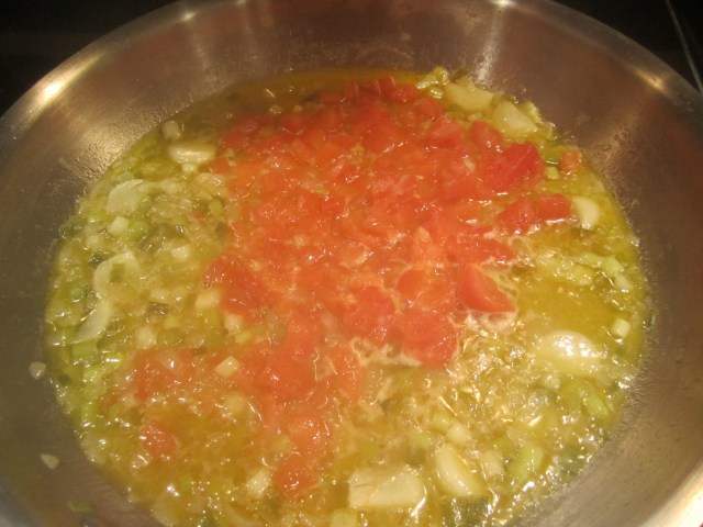 Turn up heat and add wine. Cook for a minute to reduce. Add chopped tomatoes and continue cooking on low until pasta is almost cooked.