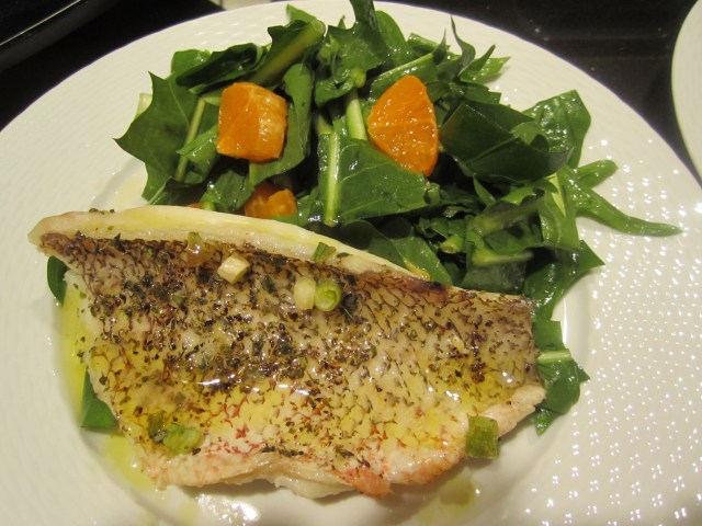 Although this dish is substantial enough to serve as a main course, today, I couldn’t resist the local hog snapper, so I made a main course of hog snapper (see my mother’s pesce in umido, substituting scallions for onions). Alongside the fish, I served a salad of local dandelion greens and Florida tangerines, dressed with red wine vinegar, agave and olive oil.