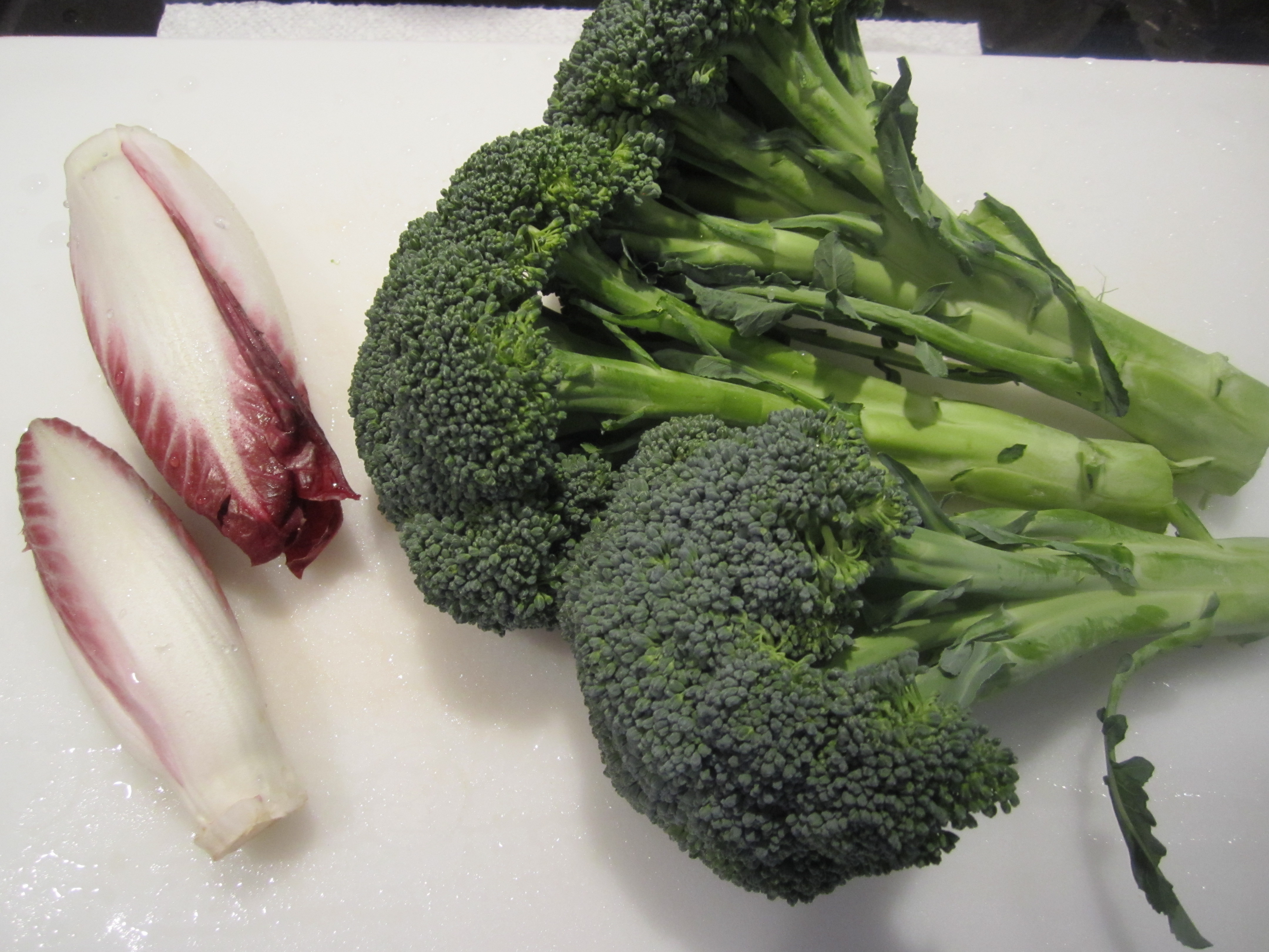 Over the weekend, I bought some beautiful Florida broccoli at the farmers’ market, and in addition, I found radicchio di treviso–that delicately bitter torpedo-shaped green that I love in salads.