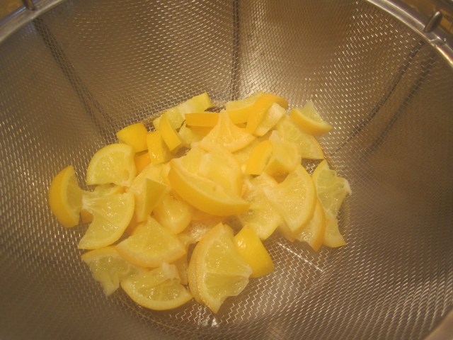 The lemons are simply blanched in water, rinsed, then simmered in a water/salt/sugar solution for 3 minutes, then rinsed. the result is a beautifully perfumey, sweet mild lemon flavor.