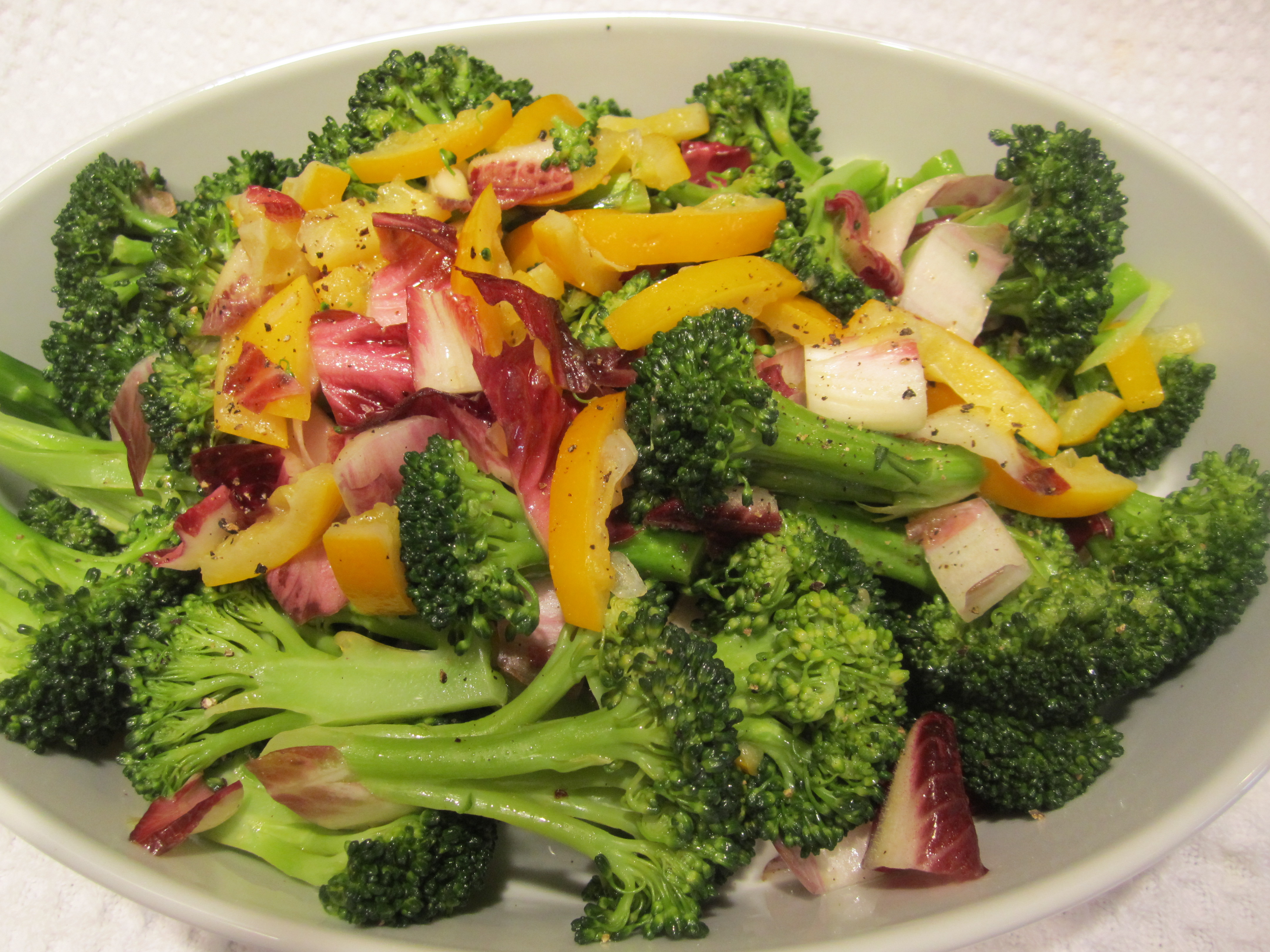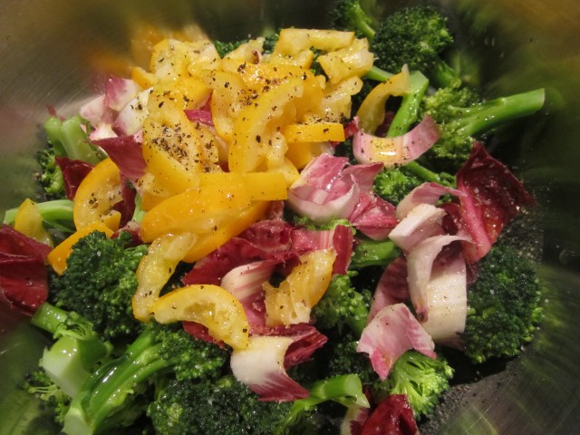 Blanch broccoli in well-salted boiling water for about 3 minutes, then drain. Slice radicchio crosswise into 1/2″ slices and toss with broccoli. Add lemons, oil and salt and pepper to taste.