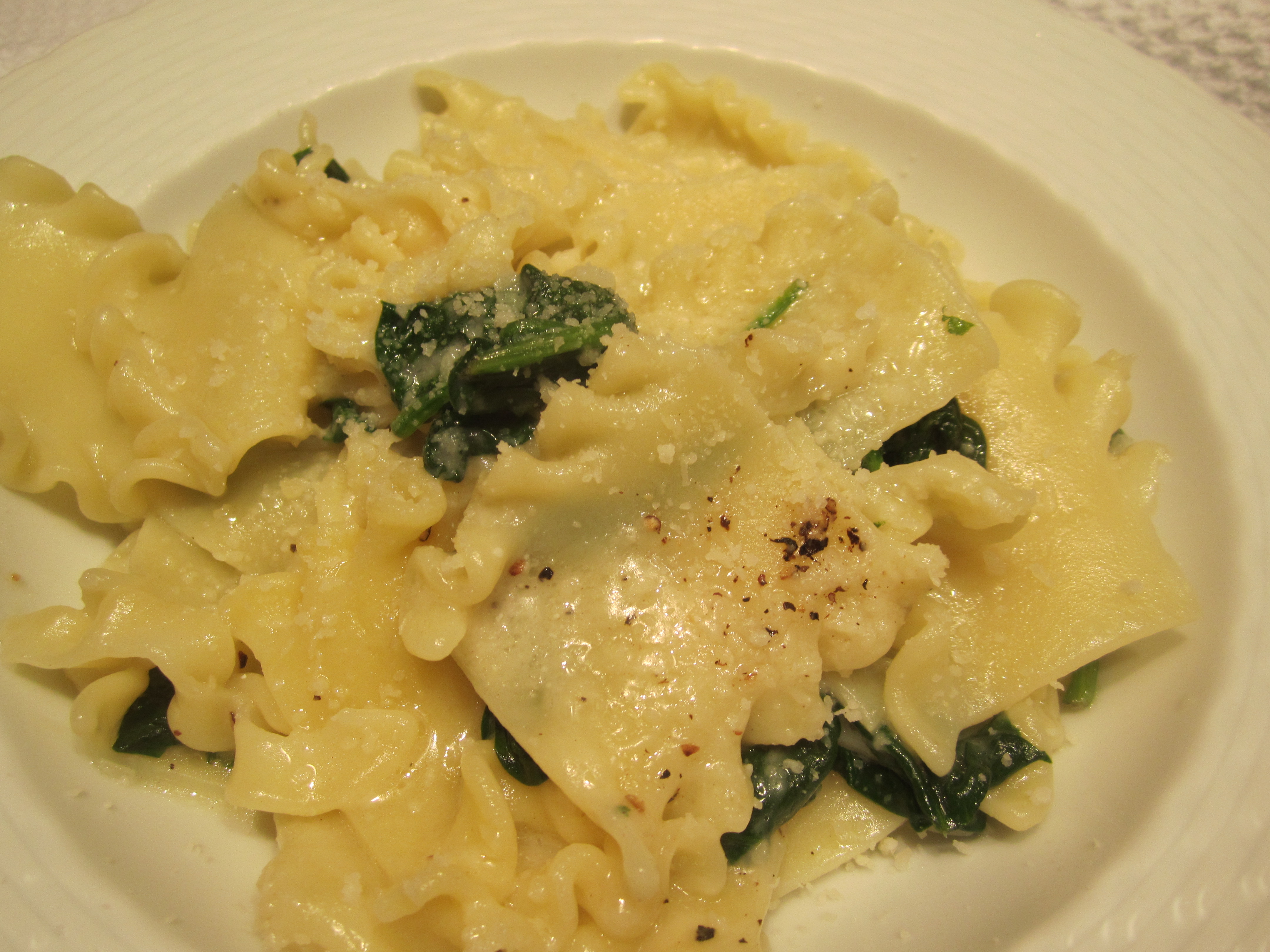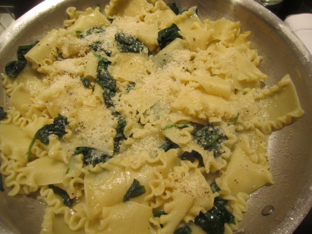 The dish can be done in the time it takes to cook the pasta. As the pasta is a couple minutes shy of done, in a large skillet, saute a pile of washed baby spinach in butter. When the spinach wilts (within a minute), add a splash of chicken broth, then top with the cooked pasta. Stir in copious amounts of grated parmigiano and black pepper.