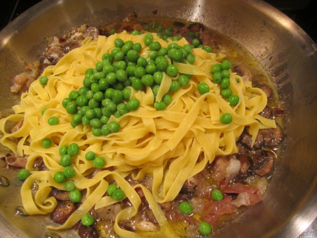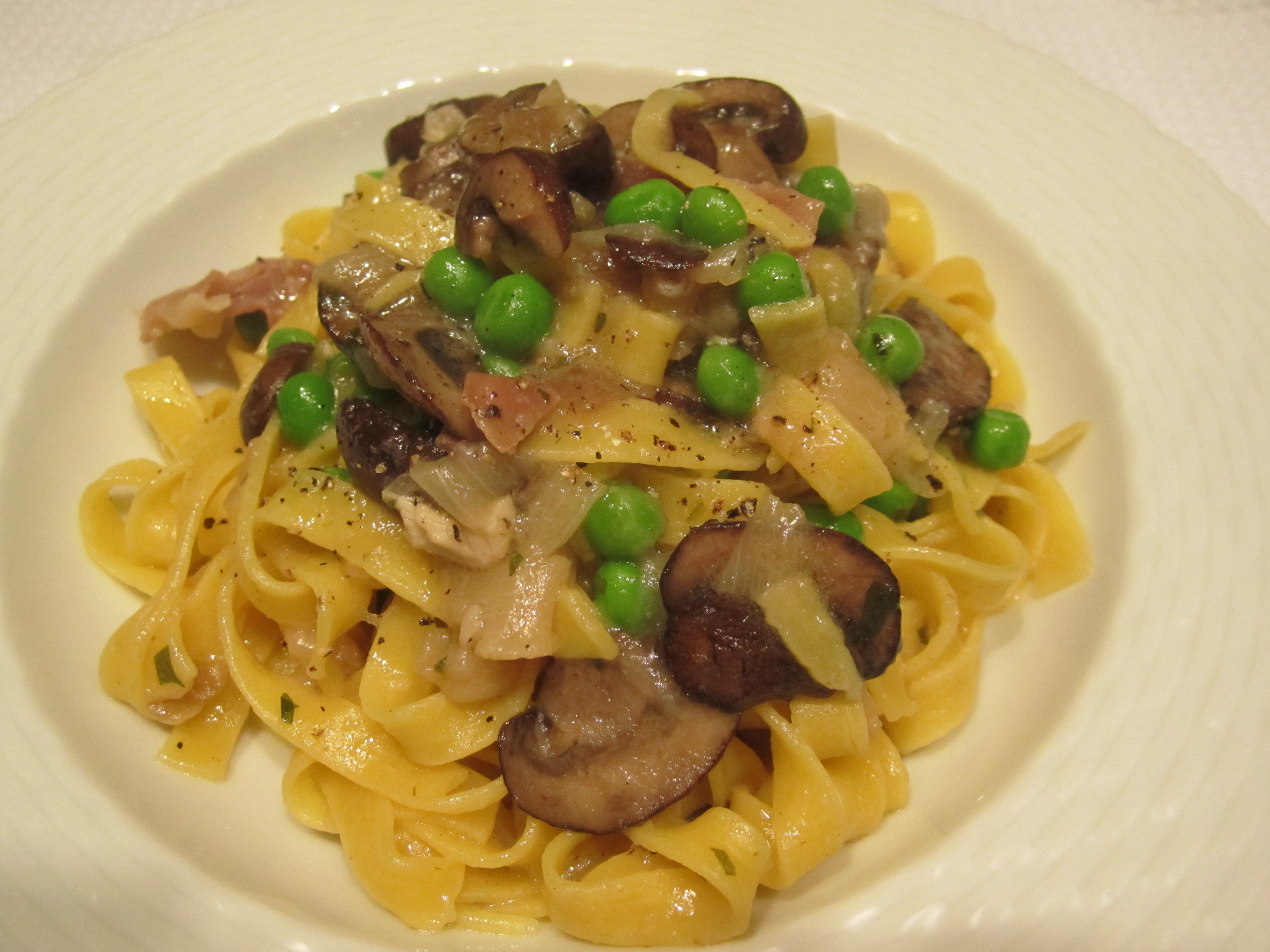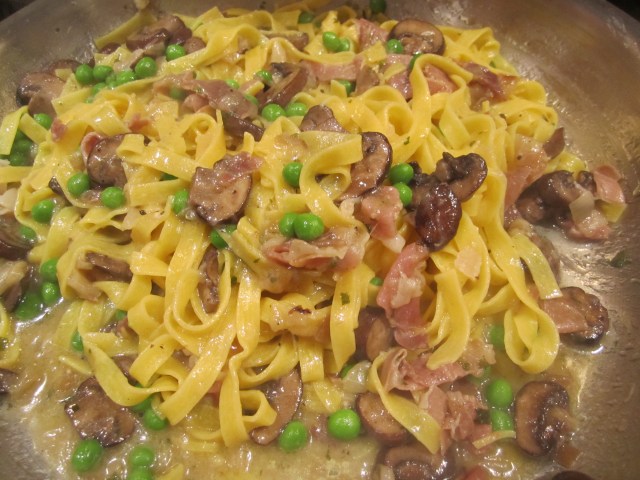 Pasta with Sauteed Musrooms, Peas and Prosciutto
