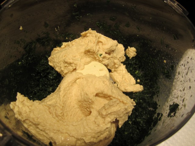 Place cooked kale leaves in the processor and pulse to chop coarsely, then add the hummus and continue processing to a coarse paste.