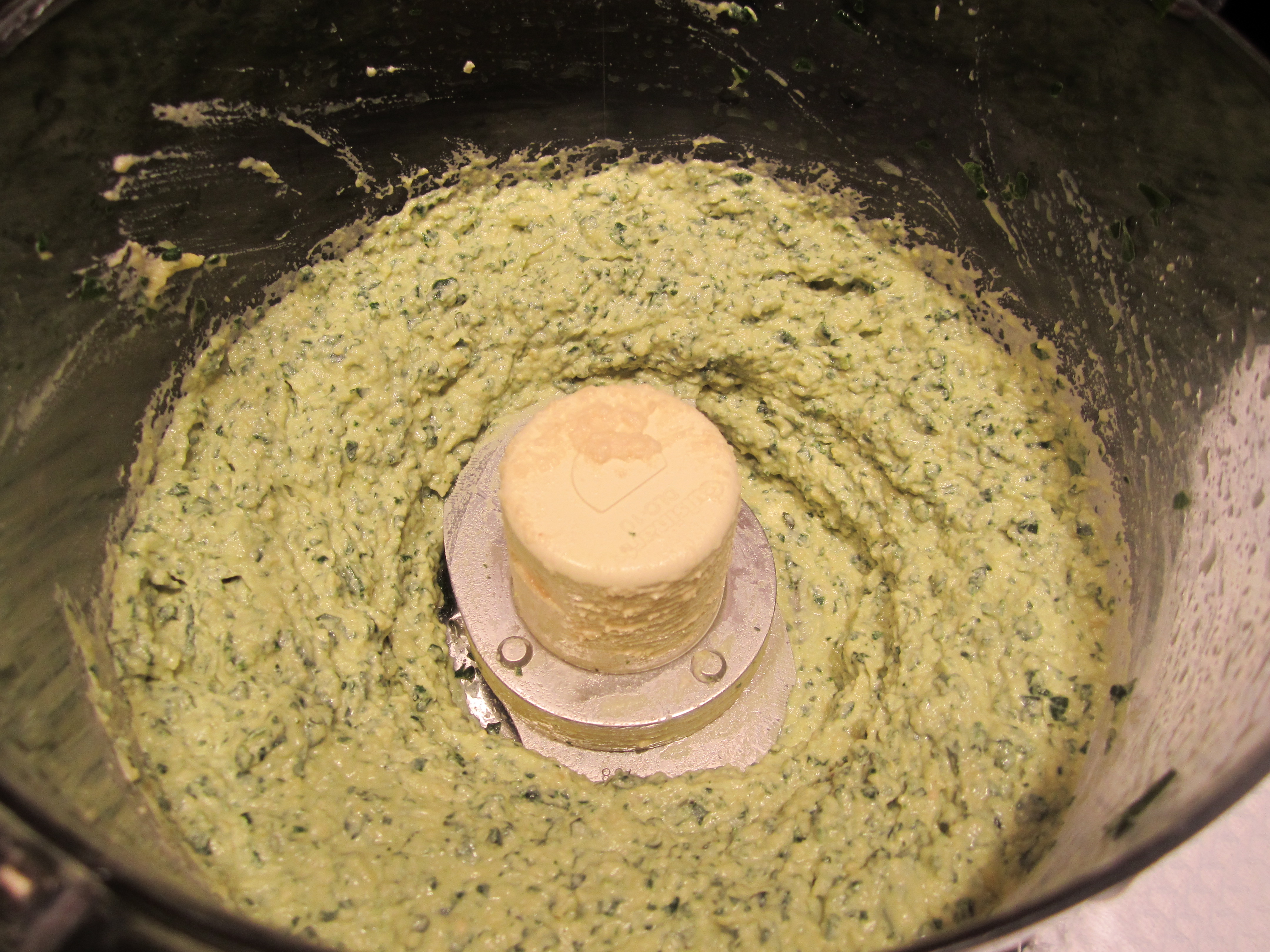 The next two recipes call for Tuscan Kale Pesto. I’ve already gone on about the virtues of this pesto that stays green, can be heated without worry of damaging its delicate flavor, and can be eaten more like a vegetable (think creamed spinach) than a sauce–I use it much more liberally than traditional basil pesto, since it’s much more delicate and less peppery. I made an extra-large batch this weekend, since I was expecting ten guests for dinner. I knew that this would be a treat for them and likely something they’d never tried before.