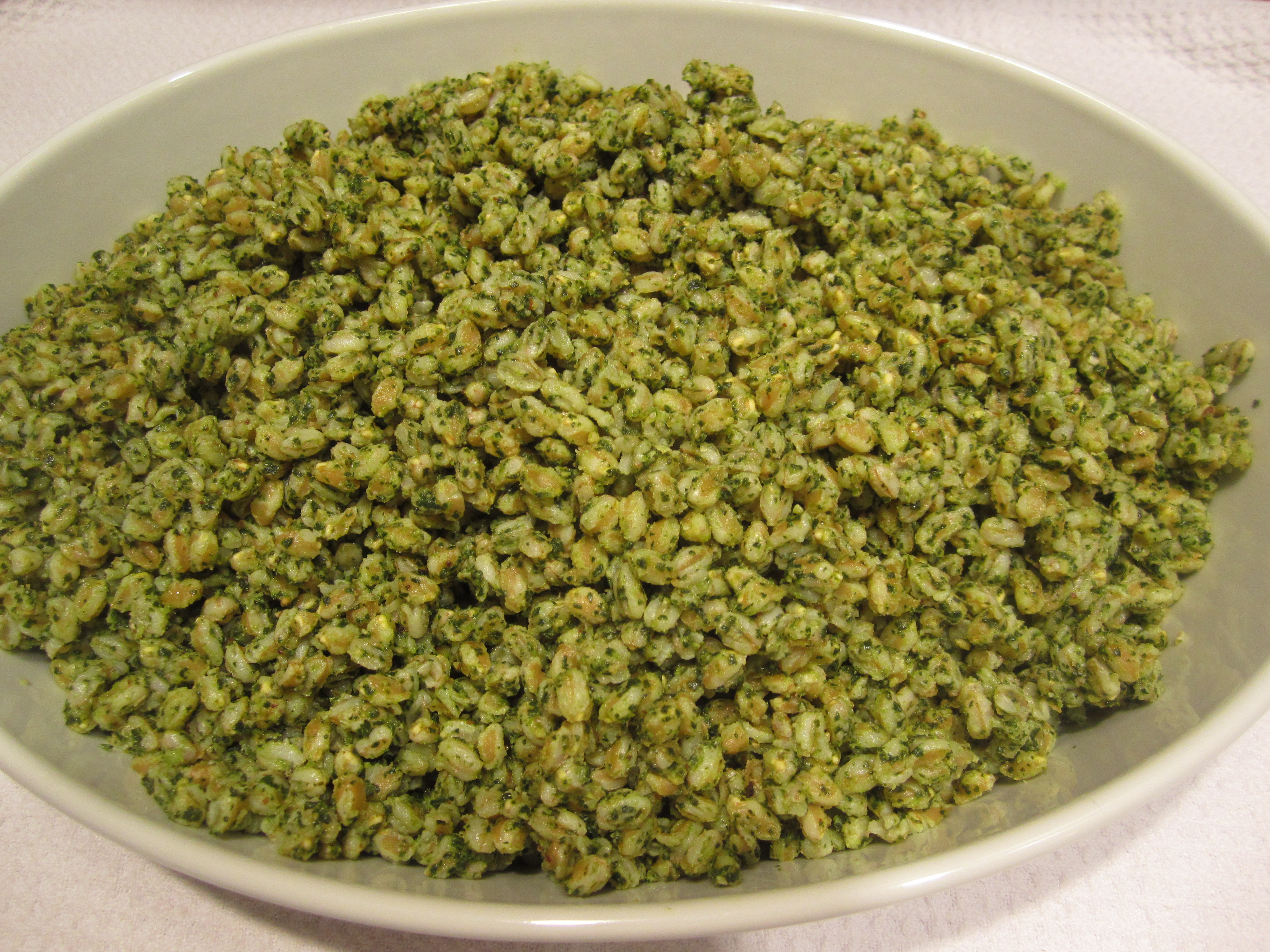 Farro ( a.k.a. emmer, spelt or triticum, depending on whom you ask) is that wonderful, nutty grain that can go almost anywhere that pasta does, but stays firm and can be reheated freely–perfect for a party. I combined the cooked farro with the pesto and some butter and gently heated the two in a large skillet. I had so wonderful much farro left over, I came up with a third dish.