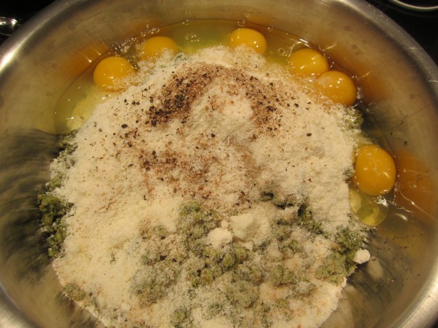 In a large mixing bowl, combine all ingredients except eggs. Taste and add salt and pepper.