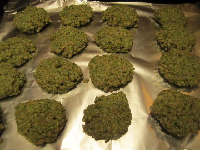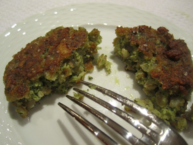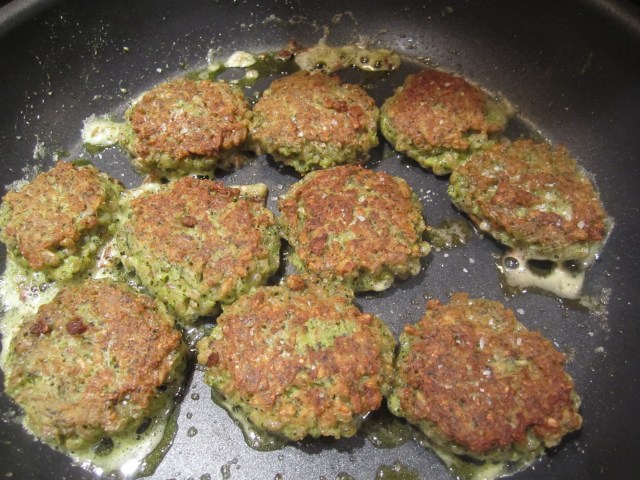 These fritters were very easy for a couple of reasons. First, the farro was already so nicely seasoned from the kale pesto, it needed little other than binder (some eggs, cheese and breadcrumbs). Second, the fritters need not be dredged in flour/egg/breadcrumbs. They can simply be formed into patties and fried with no dredging. The farro itself becomes the brown, crispy and exterior, without the need for an extra layer of breadcrumbs.