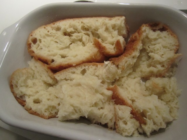 Arrange bread cubes in a baking dish and pour hot broth over them. Let them absorb the broth for about 10 minutes.