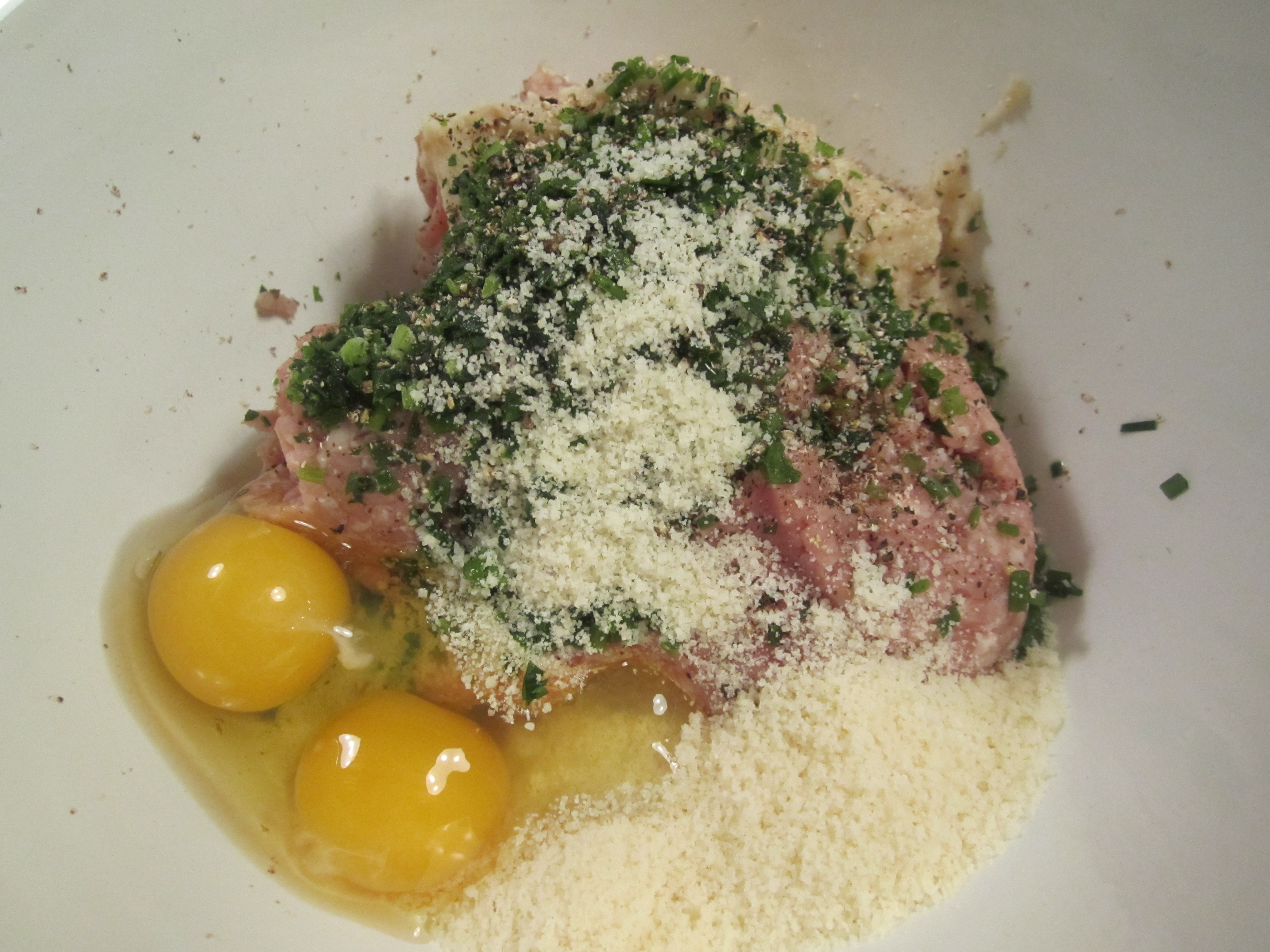 In a mixing bowl, combine veal, bread puree, cheese, herbs, eggs, salt, nutmeg and pepper.