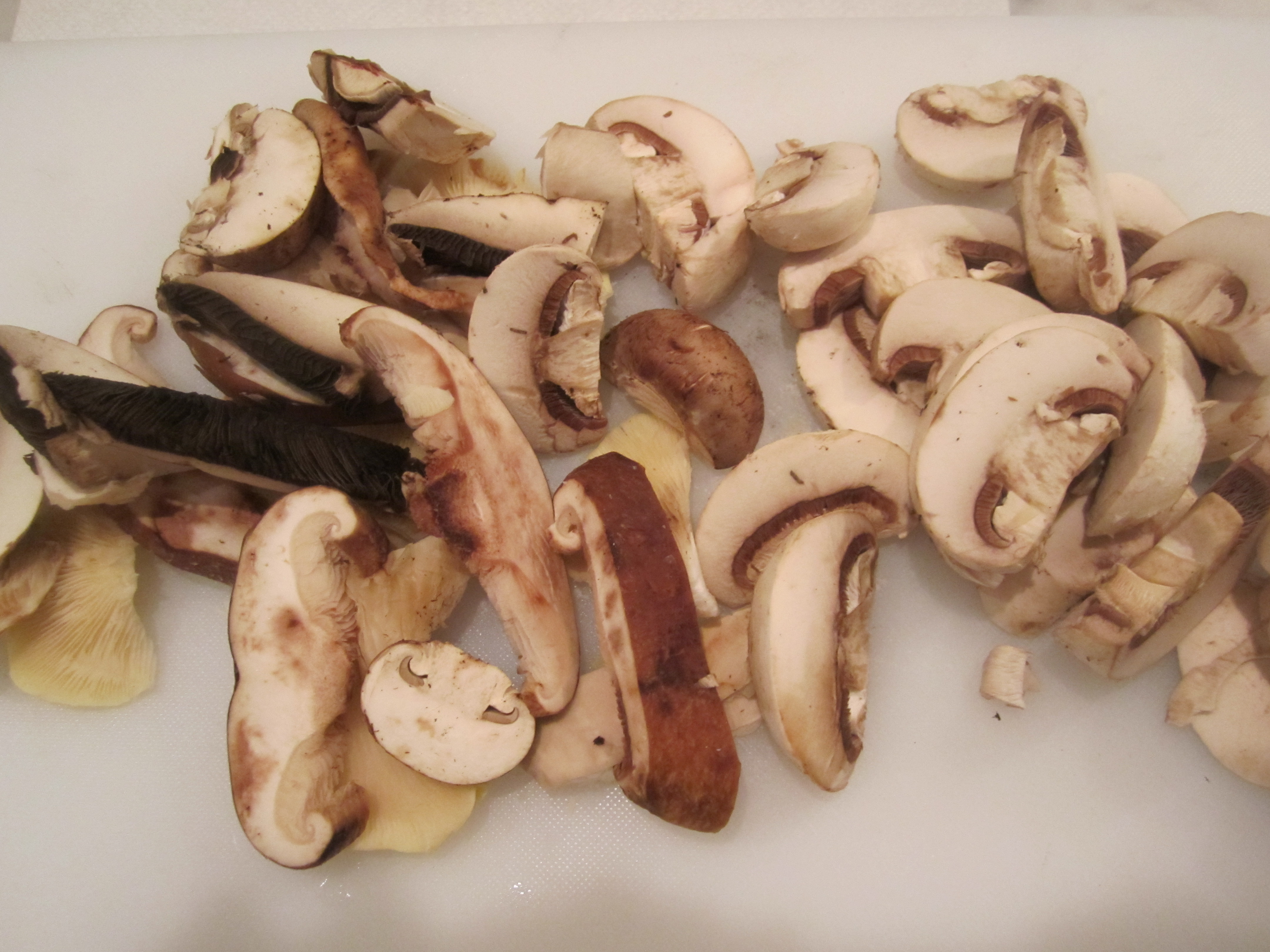 1 lb mixed white and wild mushrooms, diced into roughly 1/2″ pieces