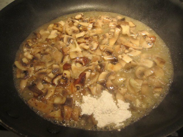 In a large skillet on high heat, brown mushrooms and shallot for about 5 minutes, or until golden. Add wine and flour, stir and reduce for a minute or so.