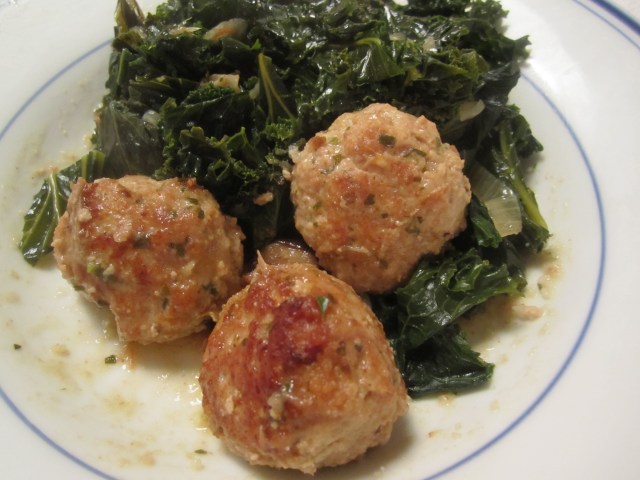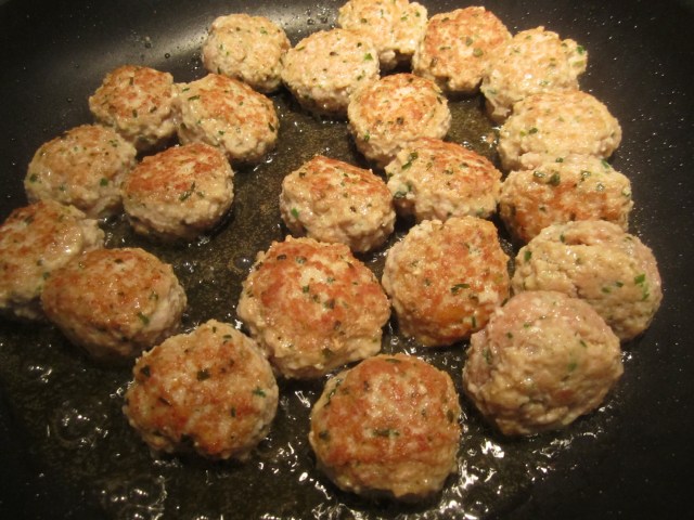 Preparation time for these meatballs is quick–a half-hour at the most. Start the sauce, then set it aside to simmer on lowest heat, then mix and form the meatballs. As the meatballs brown, they can be dropped into the sauce to poach for about fifteen minutes (or longer, if need be).
