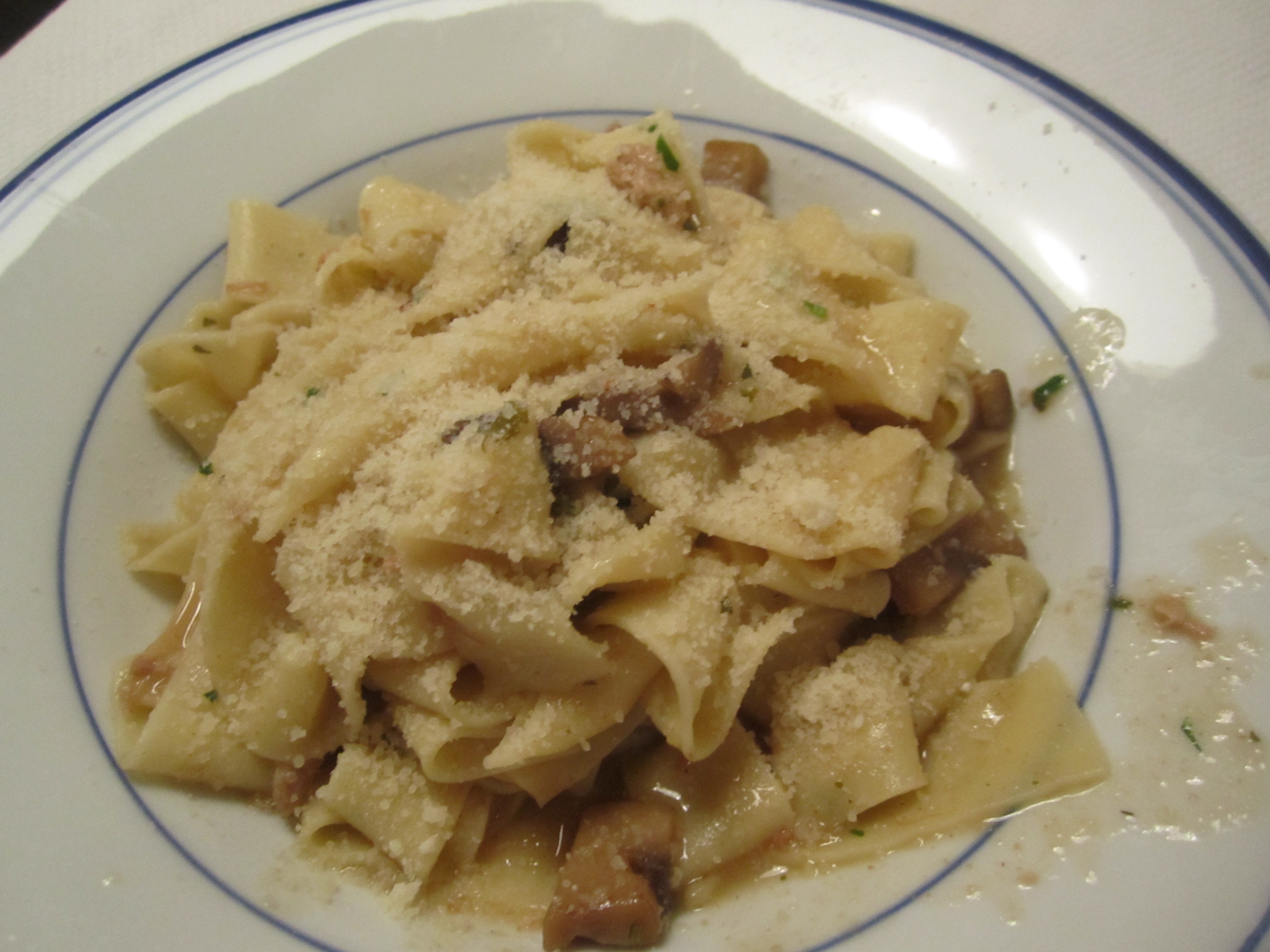 Tonight, as a first course, we had fresh egg pappardelle–always a treat, dressed with the mushroom sauce and lots of grated parmigiano sprinkled on top.