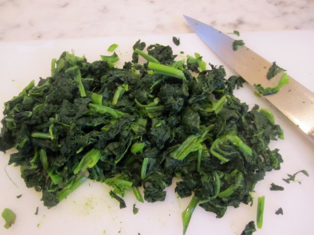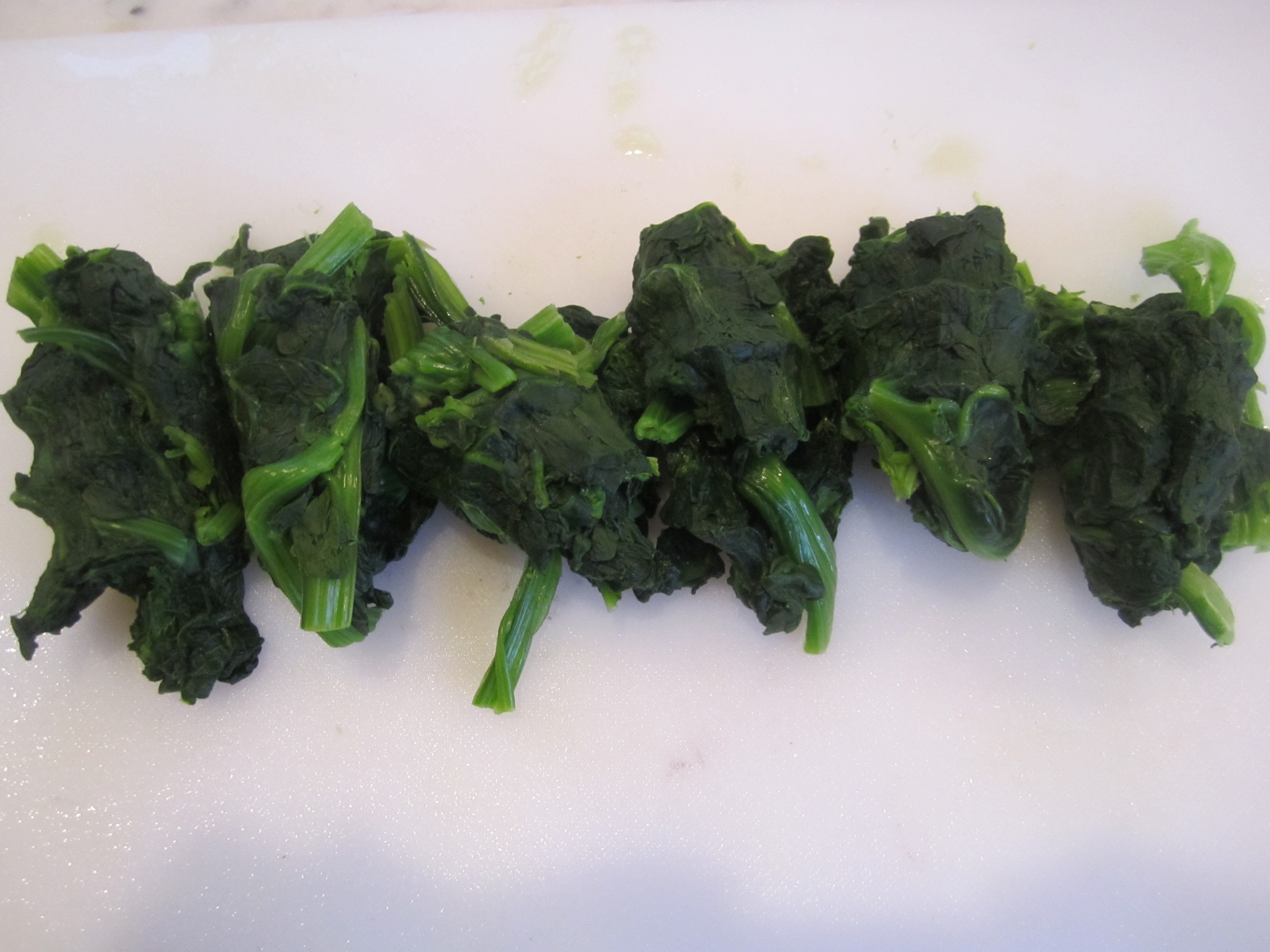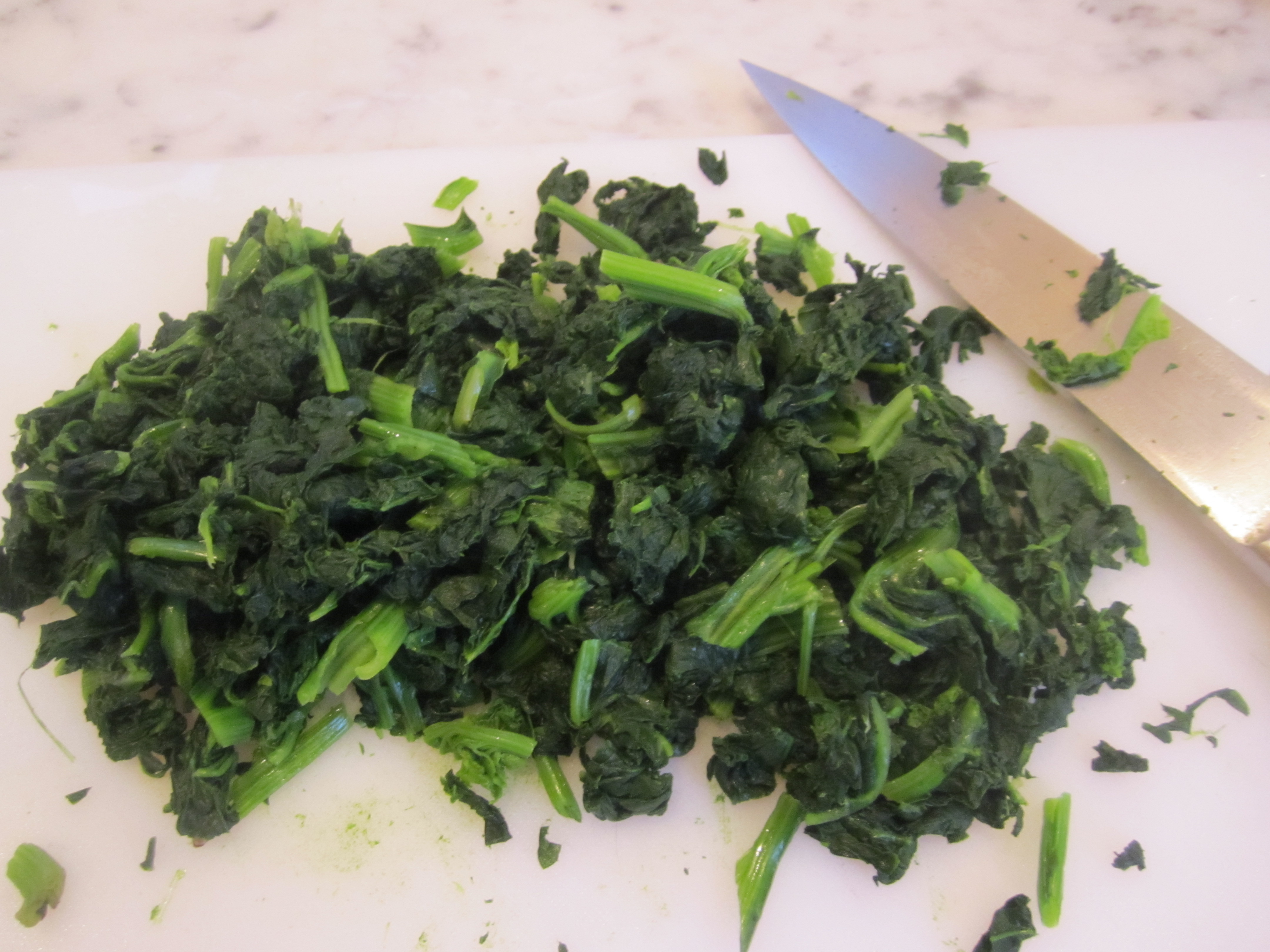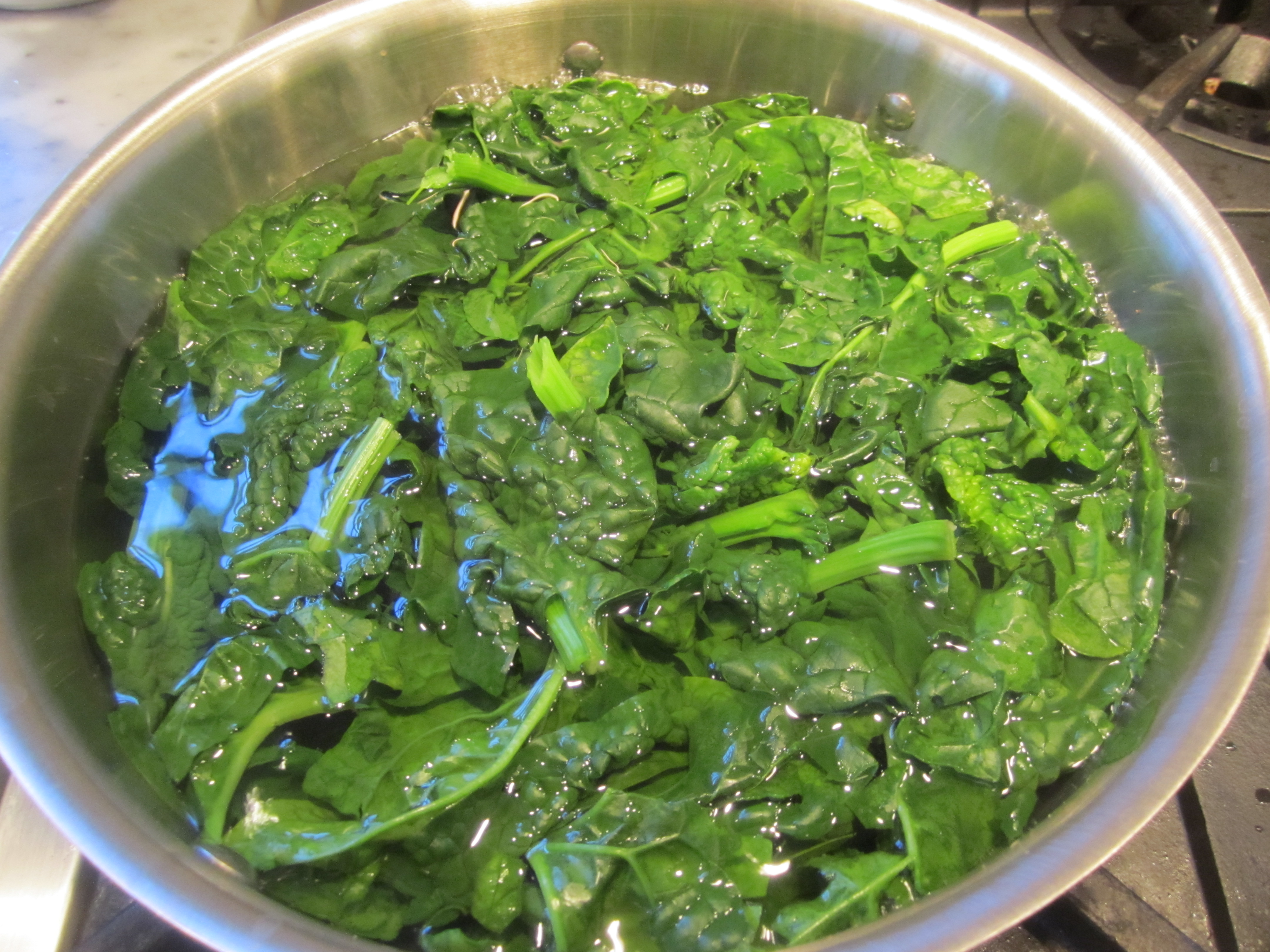In addition, many spinach recipes direct the cook to place the raw leaves in a skillet and saute in hot oil or butter. Although this results in a nice bright green vegetable, I feel it’s better to boil the spinach first, then squeeze thoroughly in small bunches to remove the bitter iron flavor. This is admittedly much more time-consuming than simply sauteing the raw leaves, but produces a much more elegant dish.