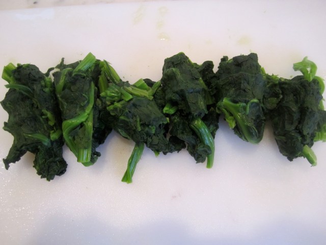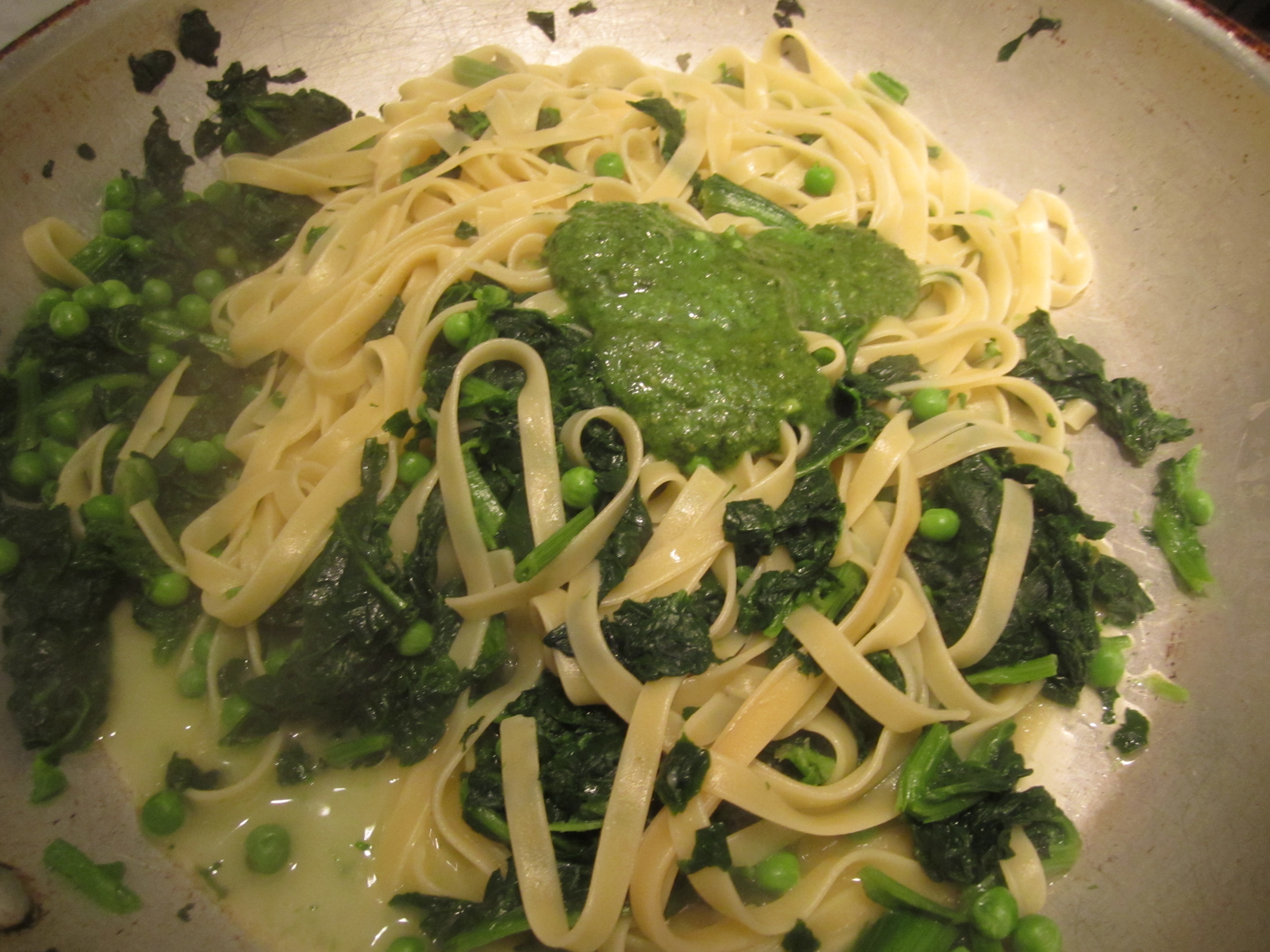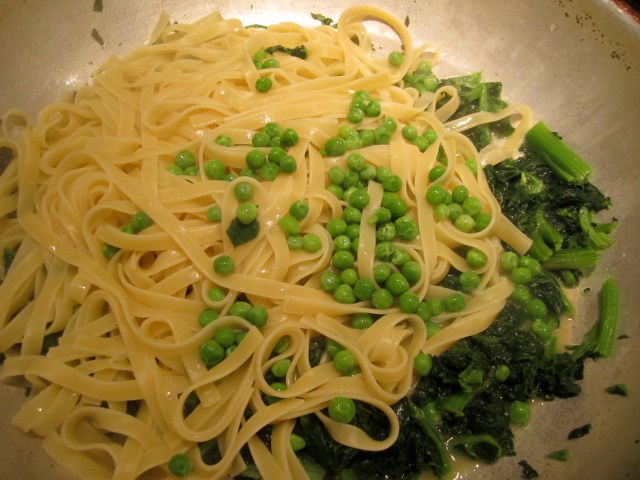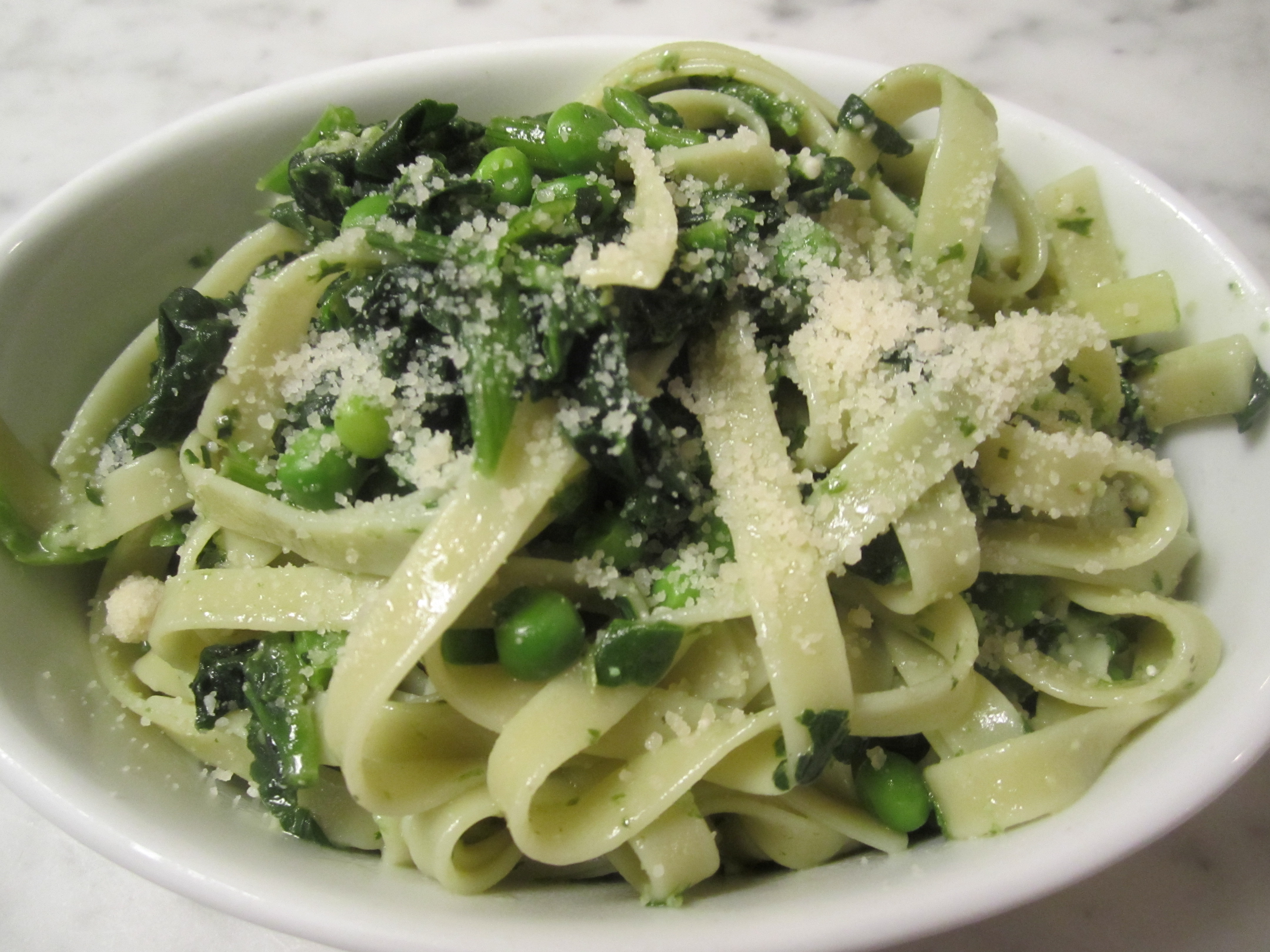 This time of year when spinach and peas are coming into season, I celebrate them in a pasta dish that’s as much vegetable as pasta. The spinach is first boiled, squeezed, chopped, then sauteed with a bit of butter and broth, then combined with pasta and blanched peas. A touch of pesto is added for herbal flavor, but not so much as to overpower the star of the dish–spinach.