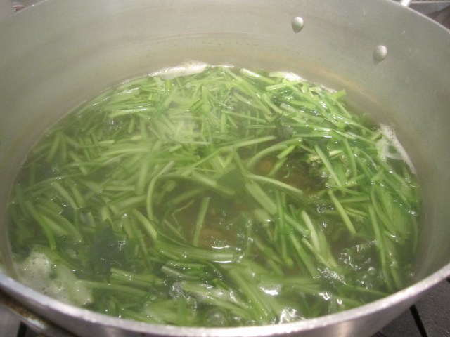 First, drop the stems into salted boiling water and boil for 10 minutes. Drain and shock in cold water. Next, drop the leaves into the same boiling water and cook for 8 minutes.
