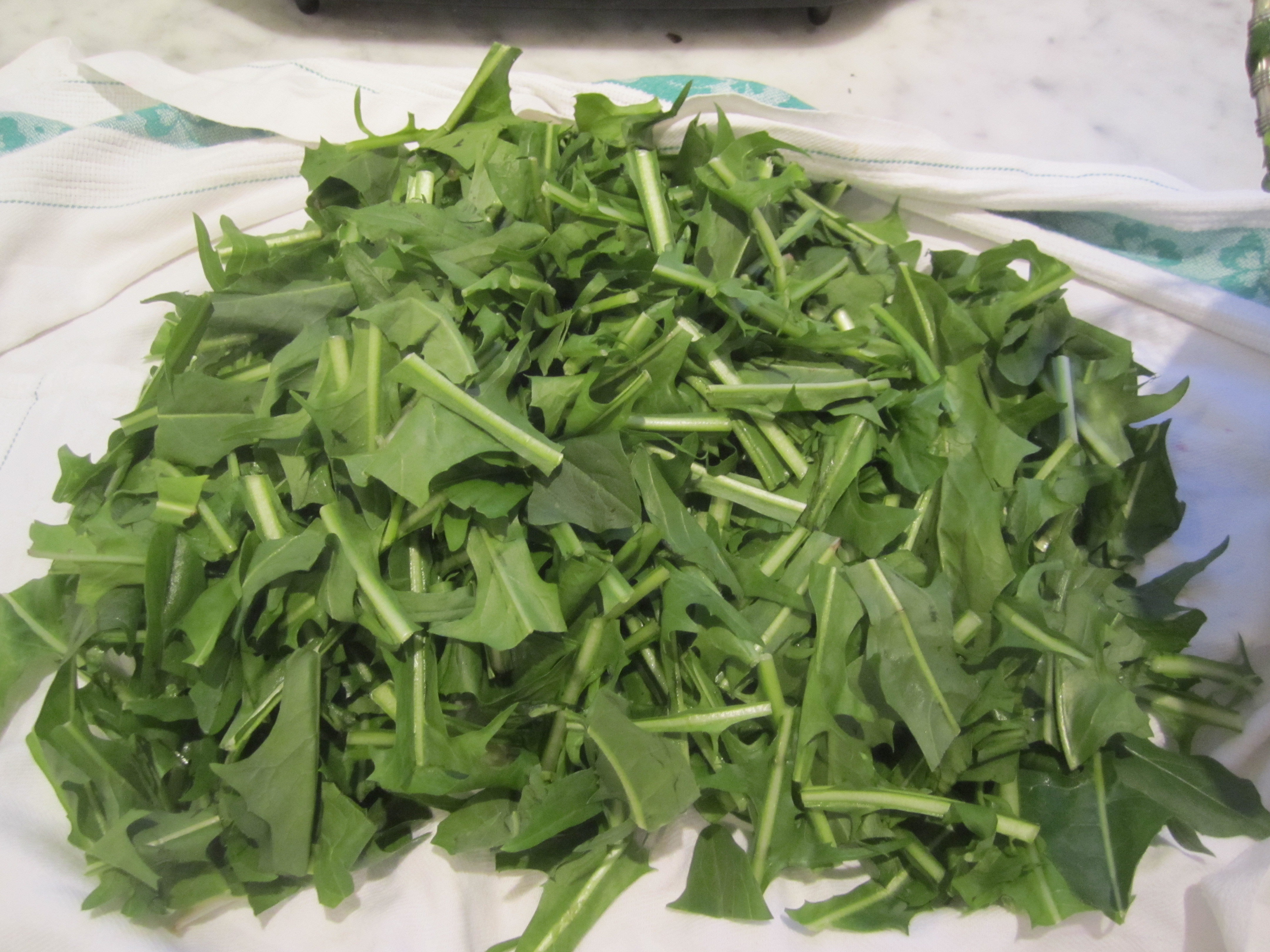 I’m usually in Italy in the fall, and at that time, every restaurant offers sauteed dandelion greens. These greens are boiled, squeezed and simply sauteed with garlic, chili flakes and olive oil. They are slightly bitter and earthy, tamed by the salt, oil and garlic.