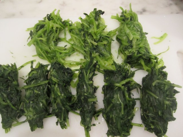 Squeeze the cooked greens well in small bundles to extract as much water as possible. Set aside until ready to saute and serve.