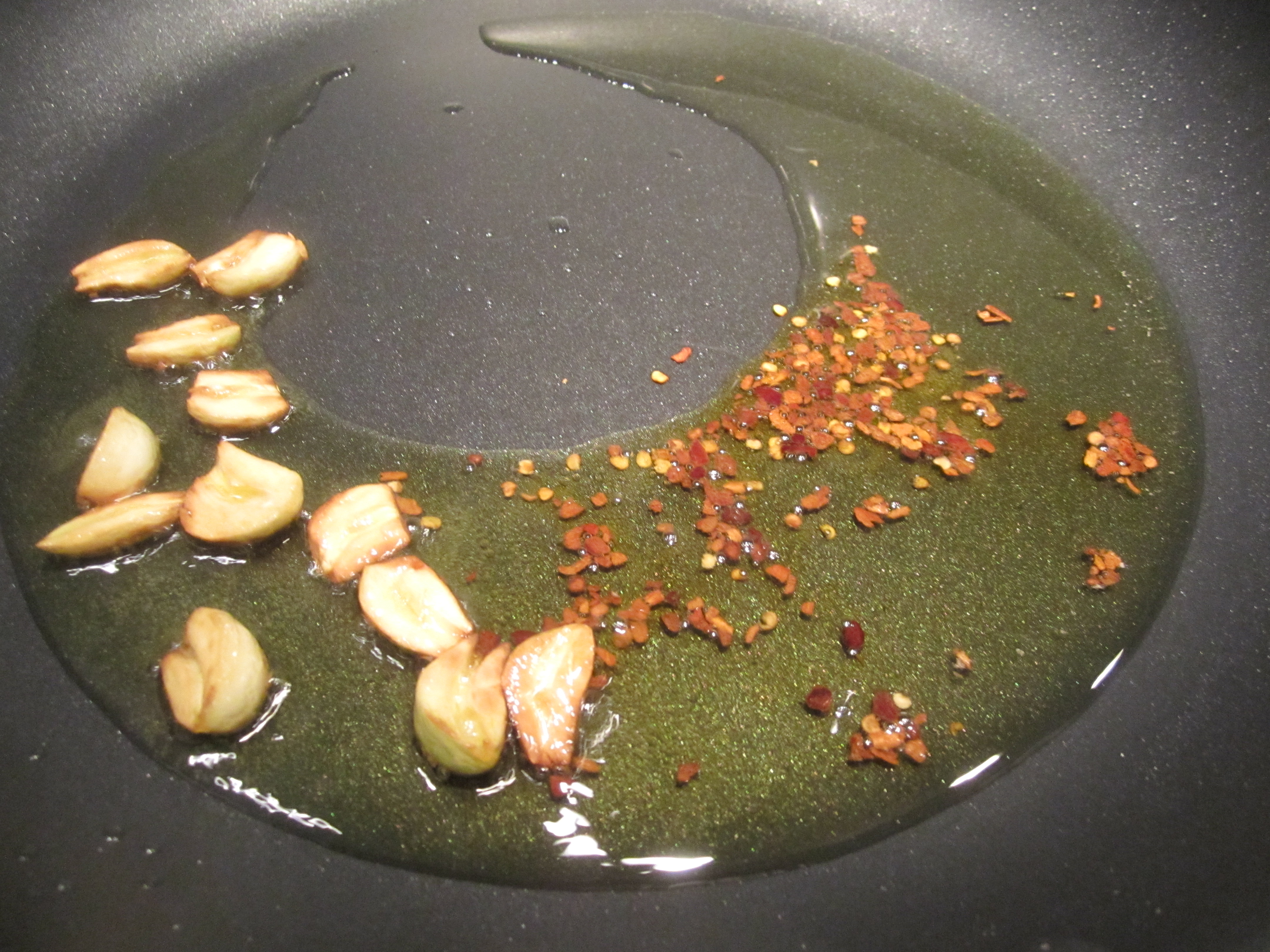 In a broad skillet on low heat, place a generous number of peeled, split garlic cloves face down in a generous amount of olive oil (at least a quarter-cup) and slowly bring to a sizzle, until the cloves are golden brown. Add chili flakes and briefly saute for a minute or so.
