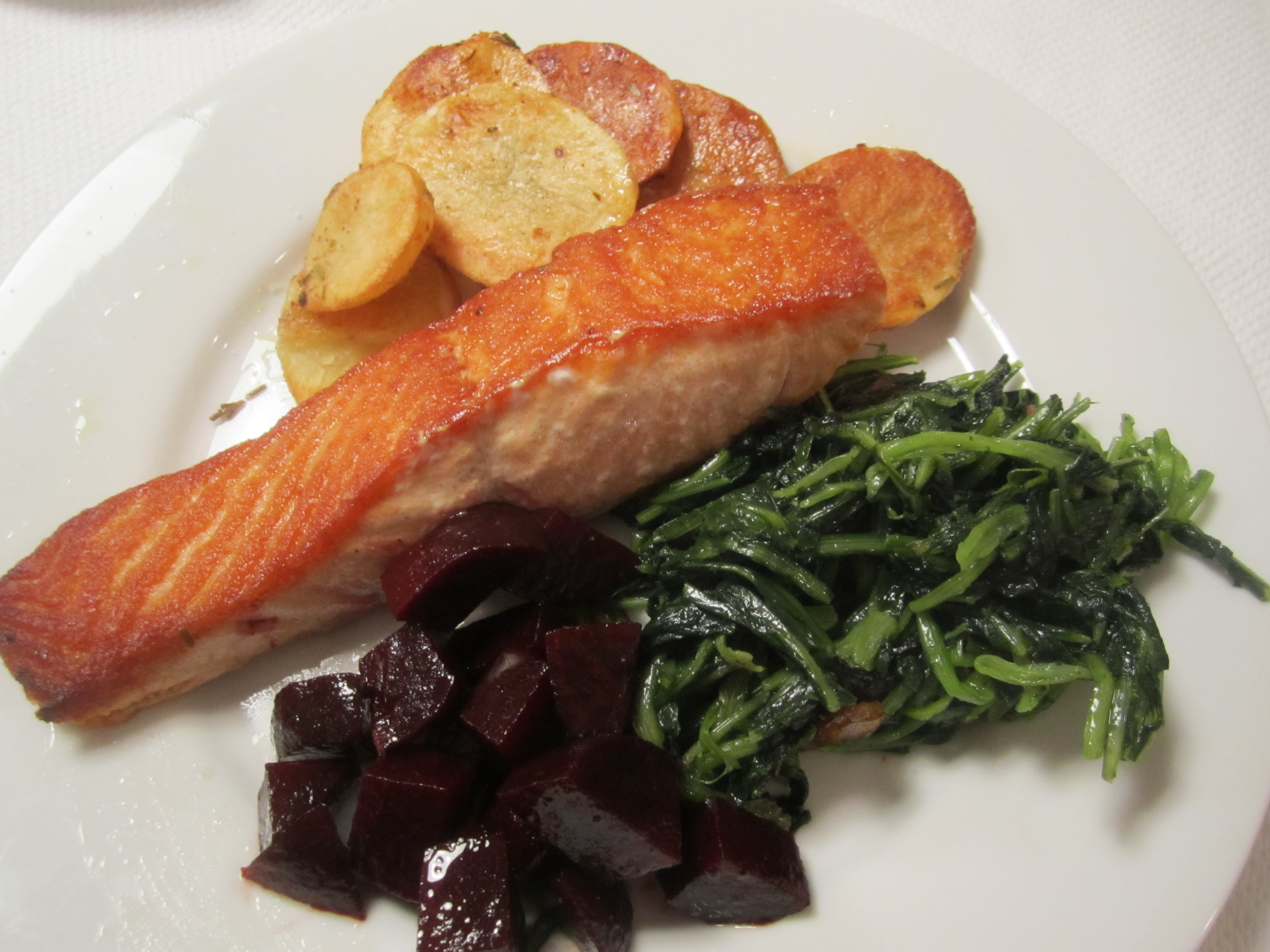 Tonight, along with the greens, I made pan-seared salmon (for the technique, see salsa verde with pan-roasted salmon), roasted beets, and roasted potatoes.