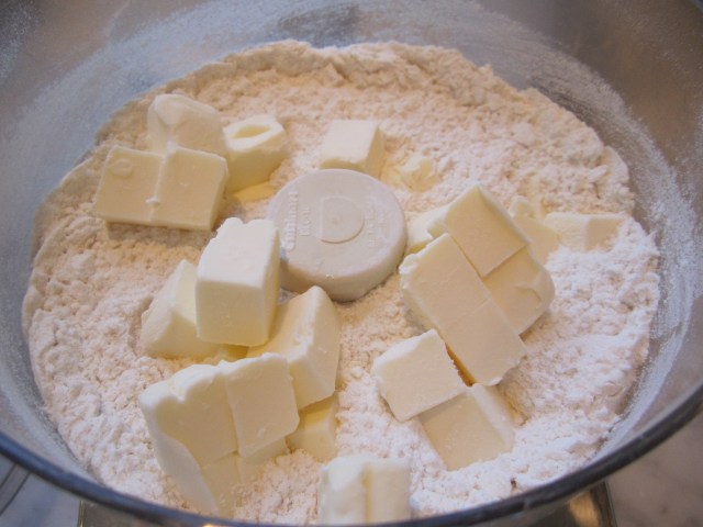 Combine the flour, baking powder and 1/2 cup of sugar in the food processor and pulse a few times to combine. Add the cubed butter (which I throw into the freezer for 5 minutes).