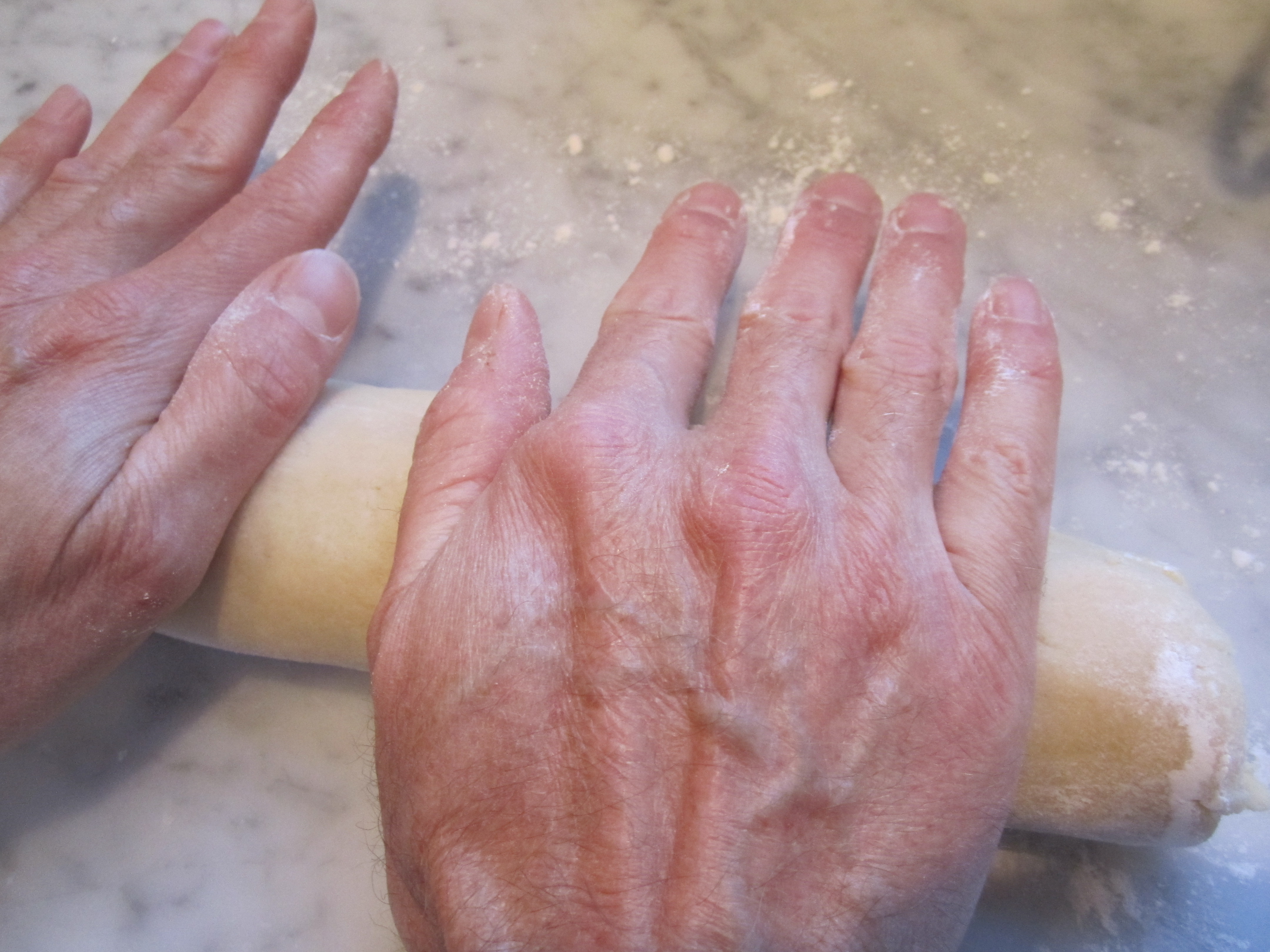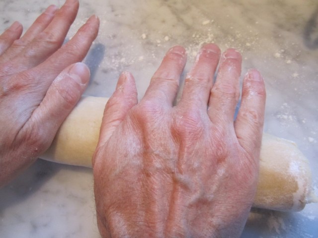 Remove from processor and place on a lightly floured surface. Gently shape into a log approximately 14″ long and 1 1/2″ diameter.
