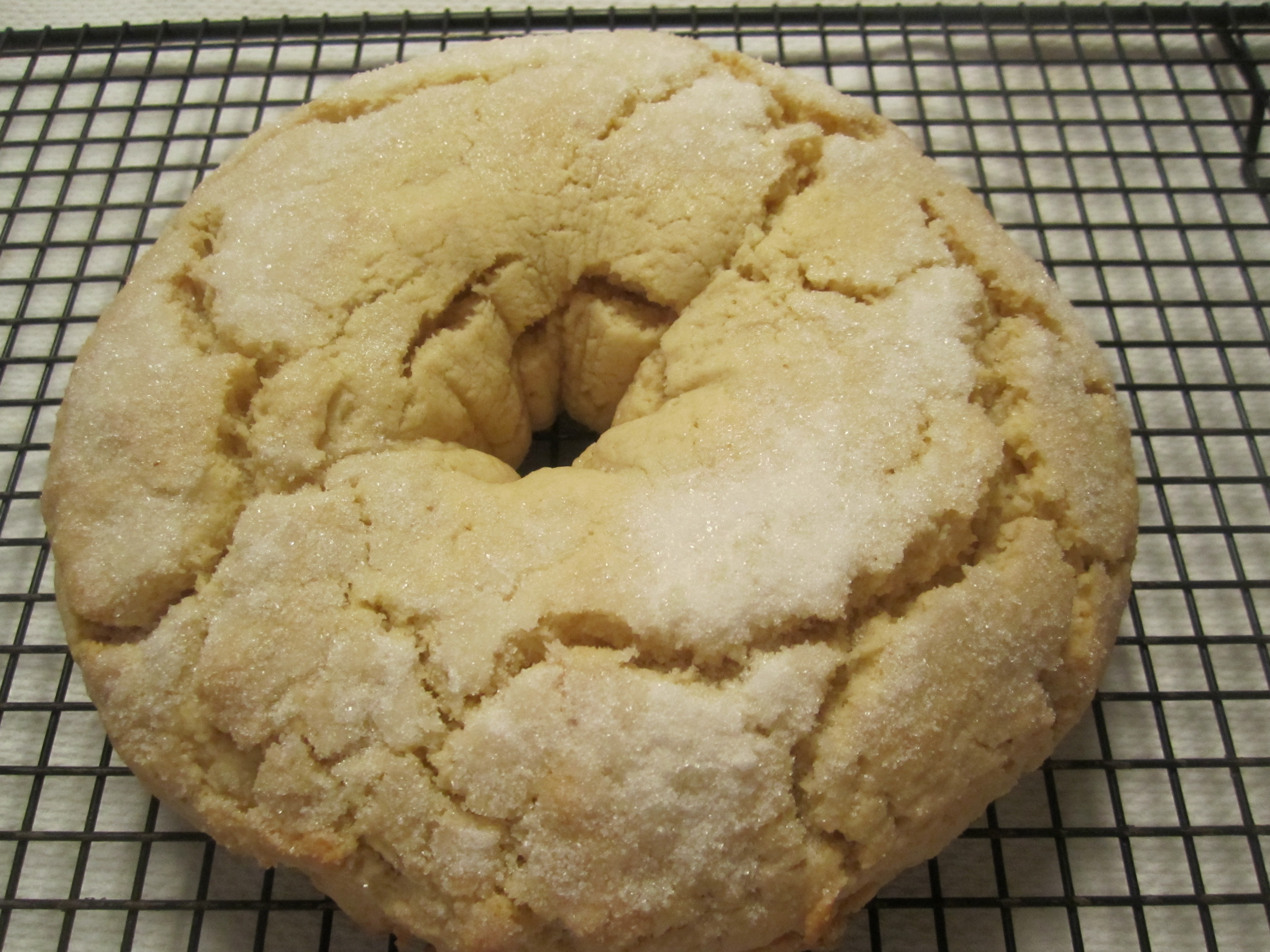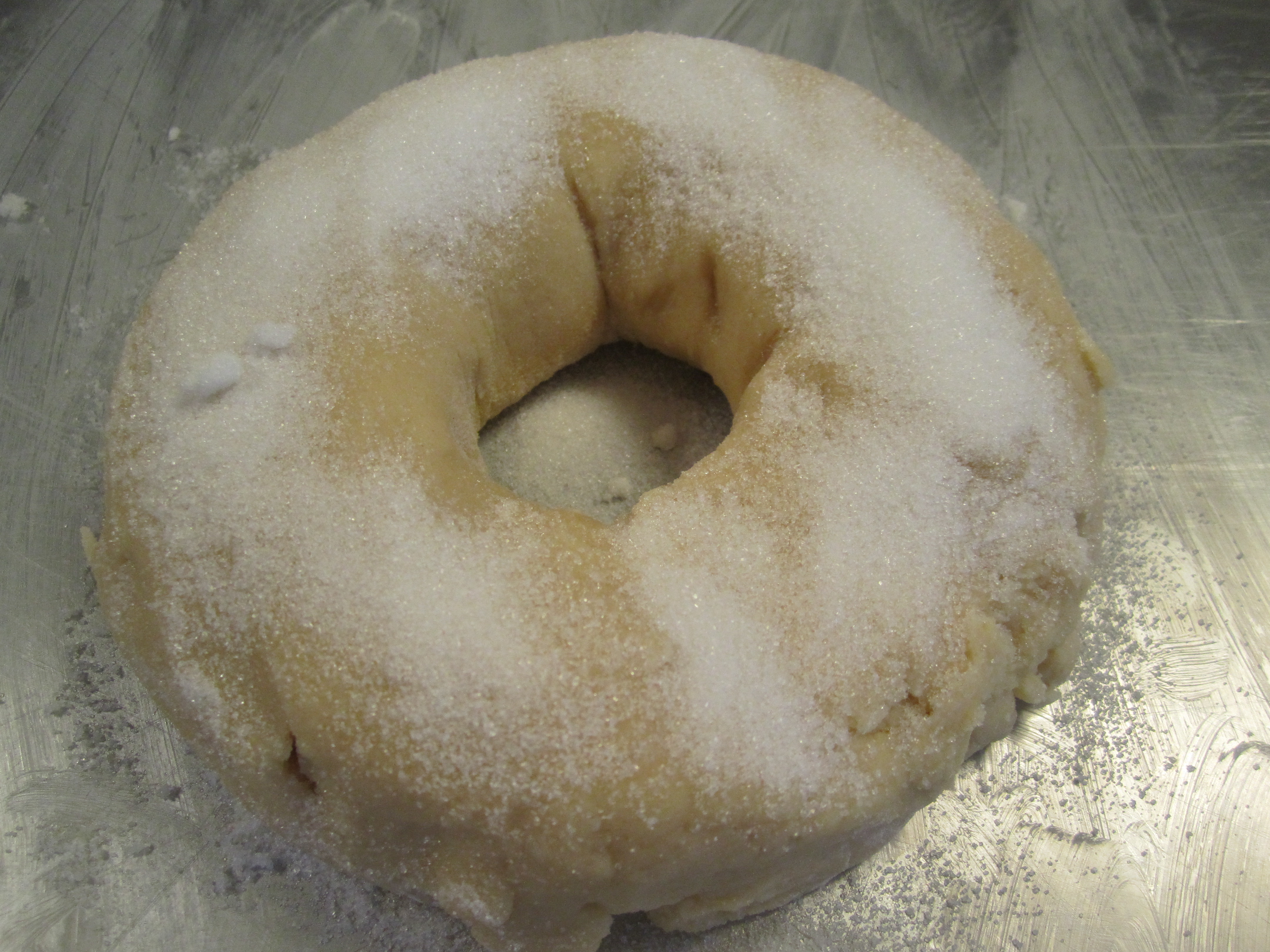 Place on a buttered cookie sheet and form into a ring, pressing the ends together to join them. Sprinkle with remaining sugar.