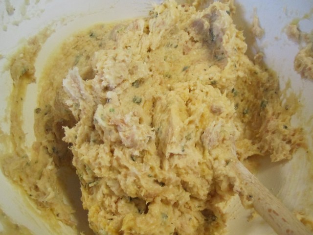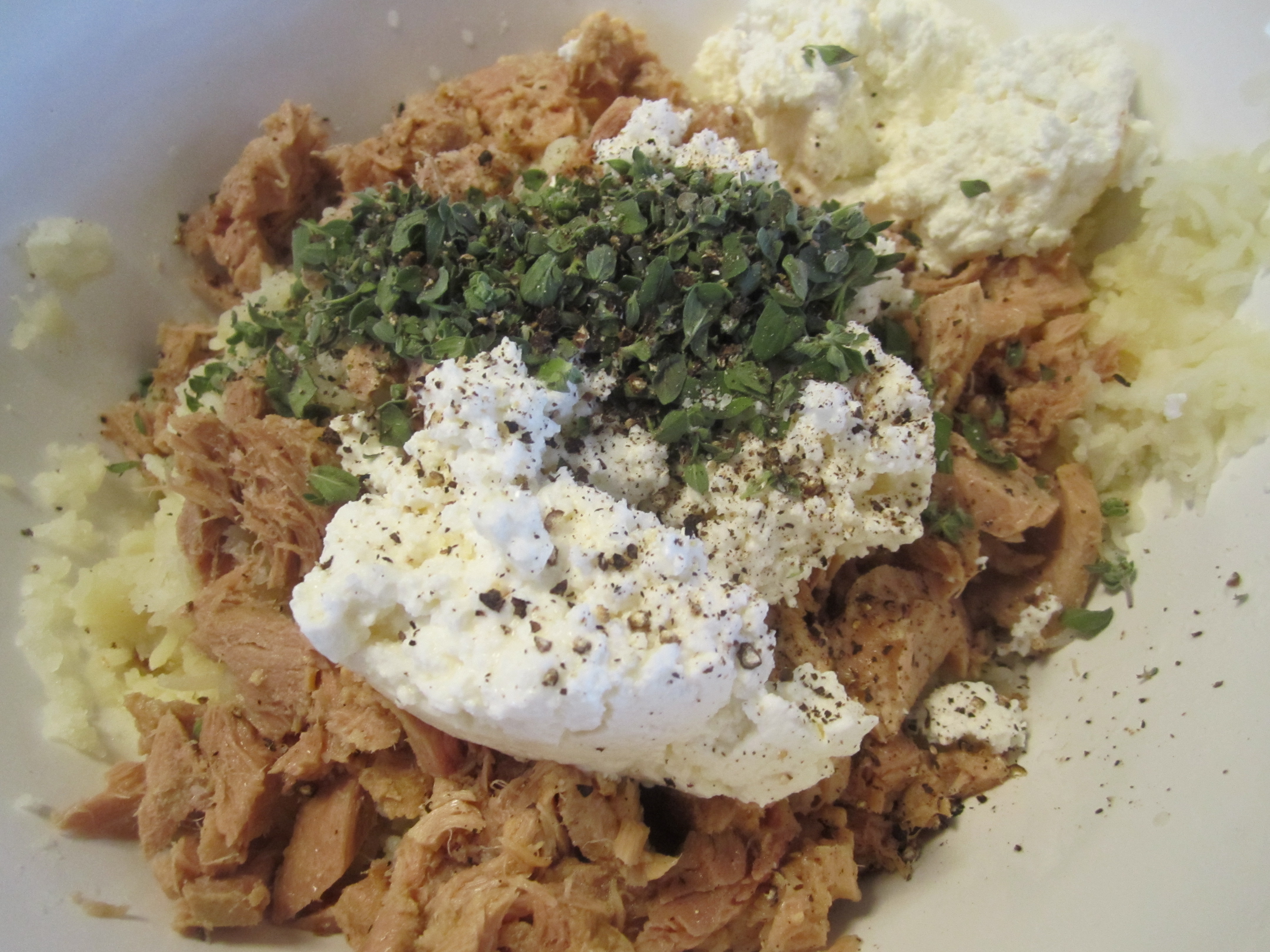 While potatoes are warm, add tuna, ricotta, marjoram, salt and pepper. Taste for salt and pepper (you’ll need to add lots of salt and pepper to get it properly seasoned).