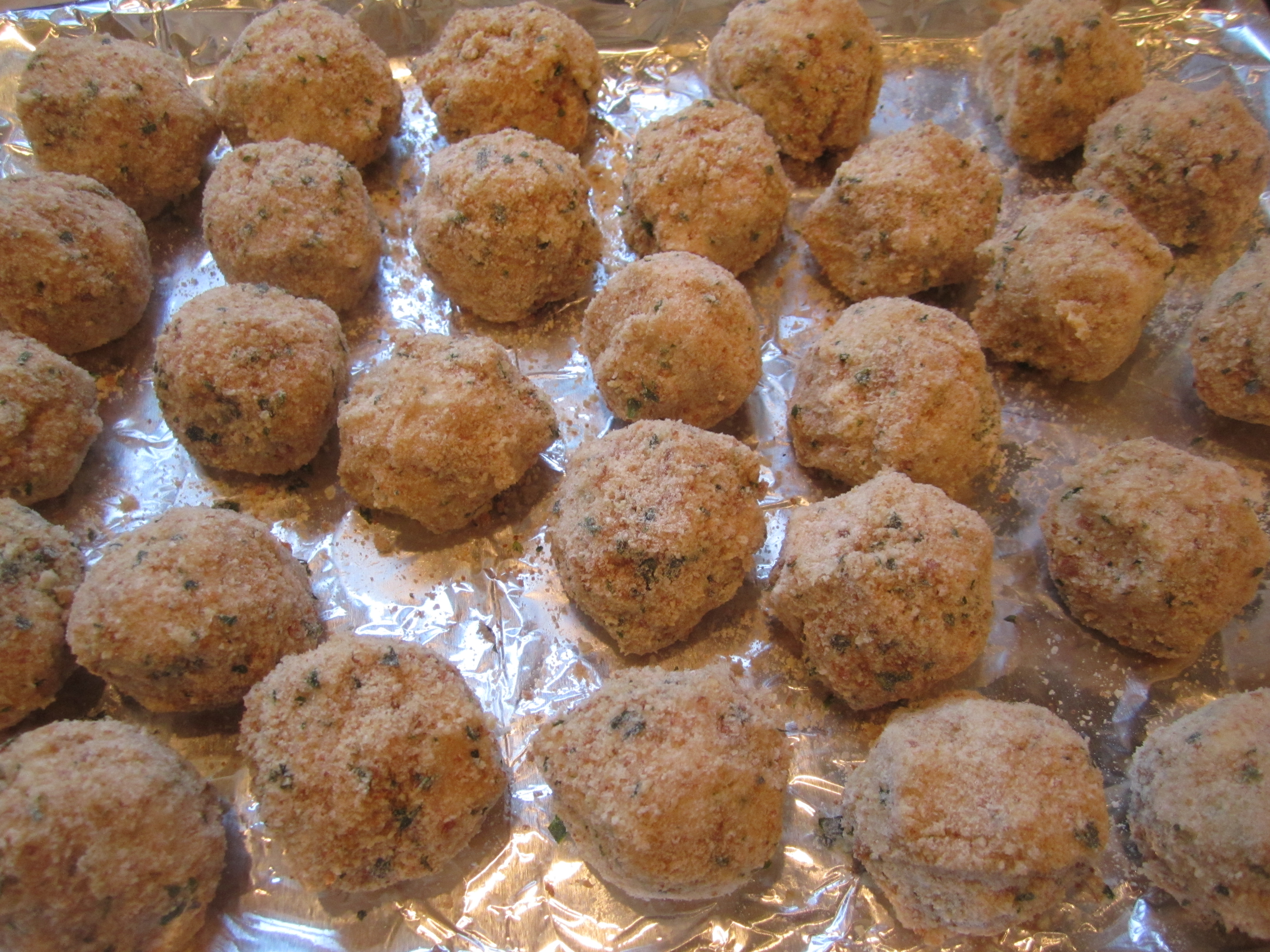 Beat remaining 2 eggs and prepare bread crumbs and flour in shallow trays for dredging. Roll balls in flour, then eggs (drain well), then crumbs. Set aside until all are breaded.
