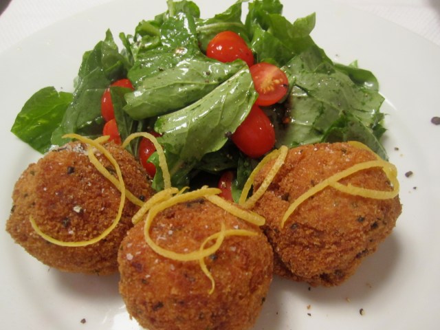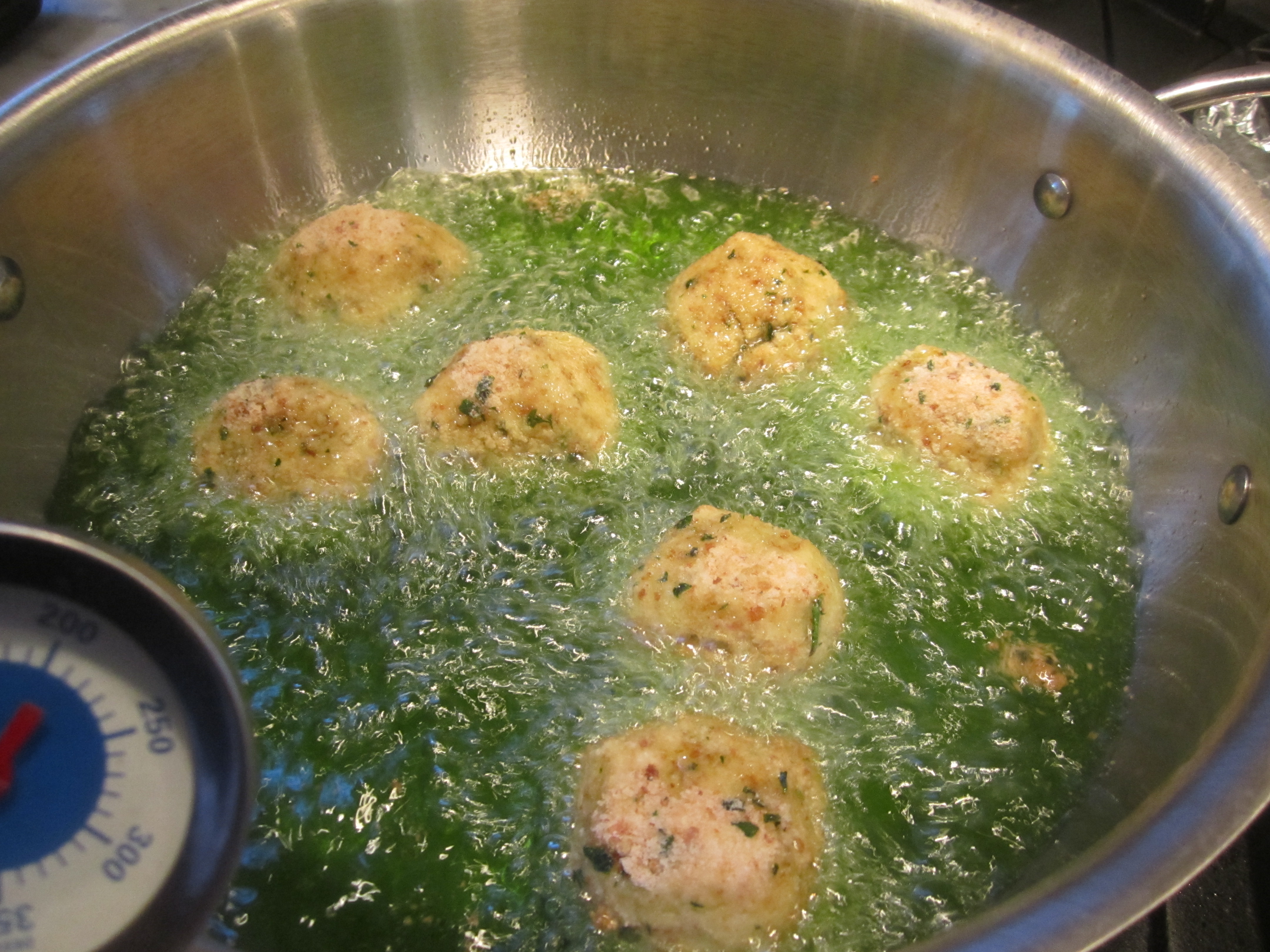 Rather than my usual pan-frying, these croquettes get deep-fried in extra-virgin olive oil. If you keep the oil at the proper temperature (350 – 370 degrees), it will be a bit scorched and not recyclable by the end of the process, but you’ll have a wonderful bunch of crispy/ tender little balls that are a great lunch, along with a bright green salad.
