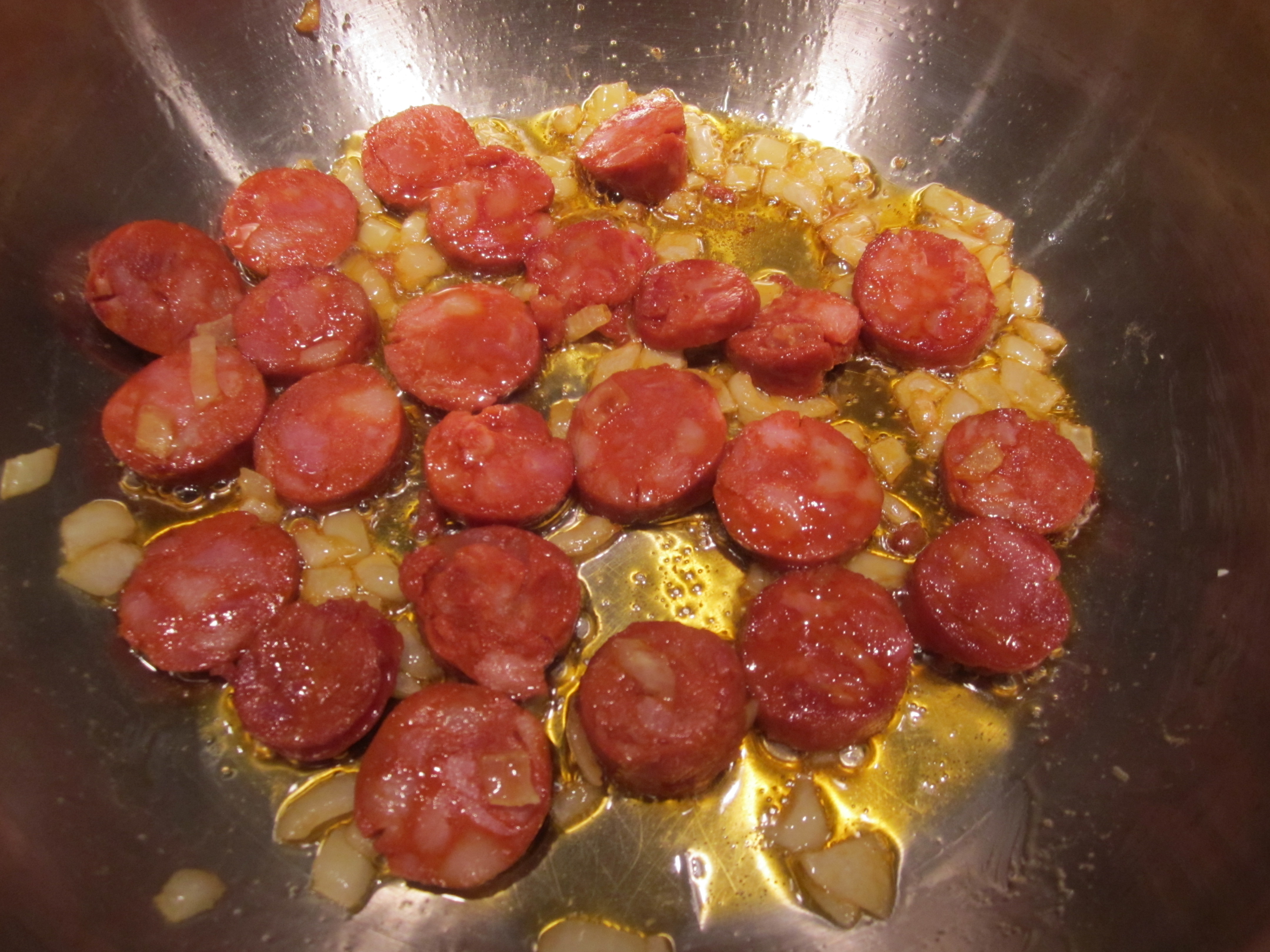 4 links of smoked chorizo, peeled and sliced into 1/4″ rounds
